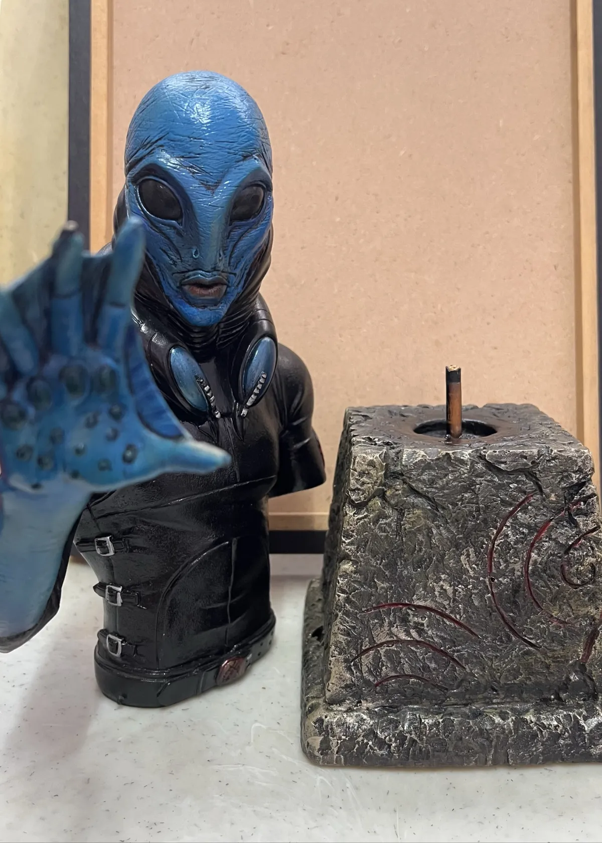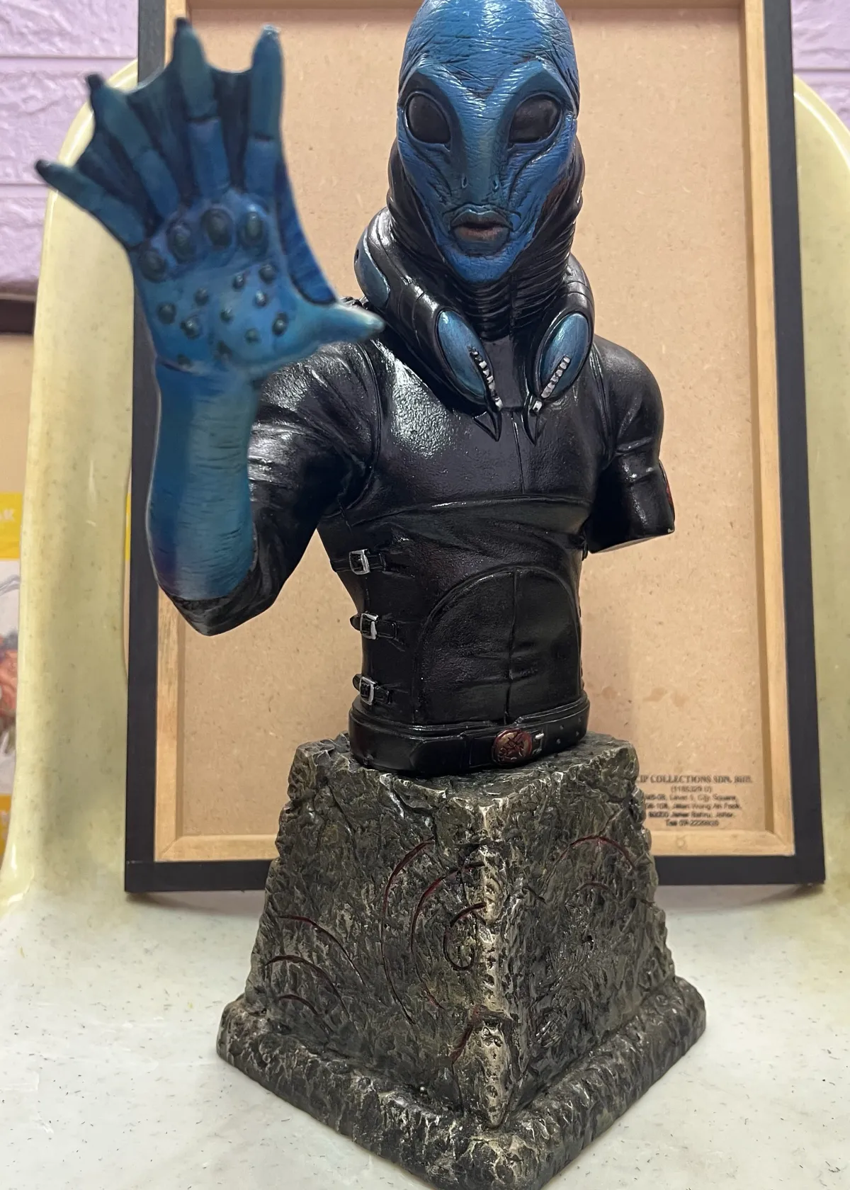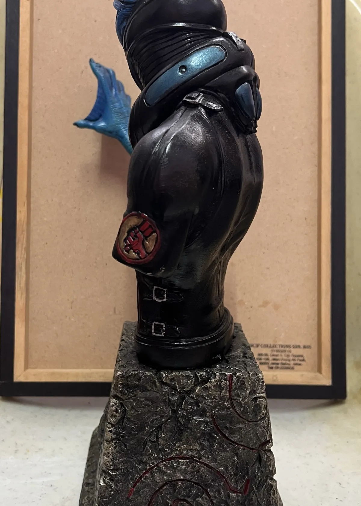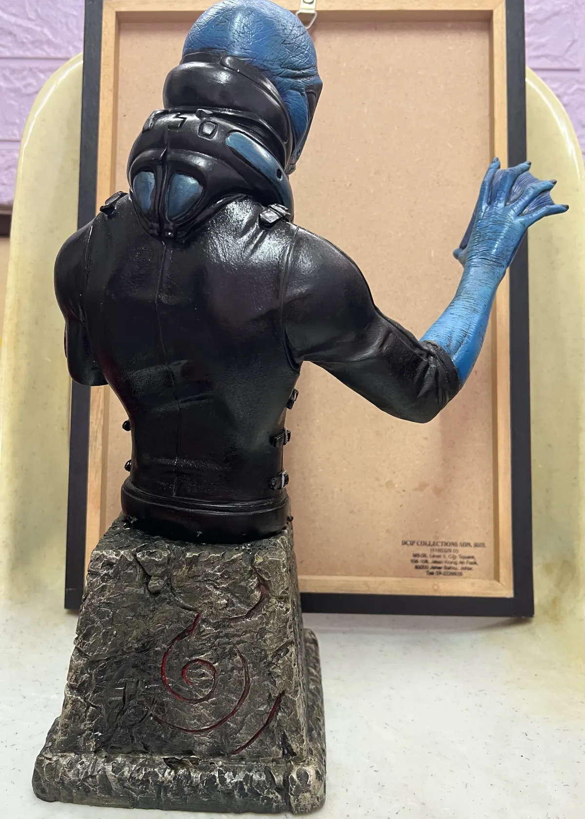 This is a collectible bust of Abe Sapien, detachable base and character, a bit loose when attached, there’s a bit crack at the base as shown in photo, approximately height of 32cm-34cm (including base), the aquatic action hero from the Hellboy series. Featuring intricate detail on the face, suit, and base, this figure is perfect for fans of the comics or movies. The statue stands on a textured base resembling stone, with eye-catching blue and black paint application.