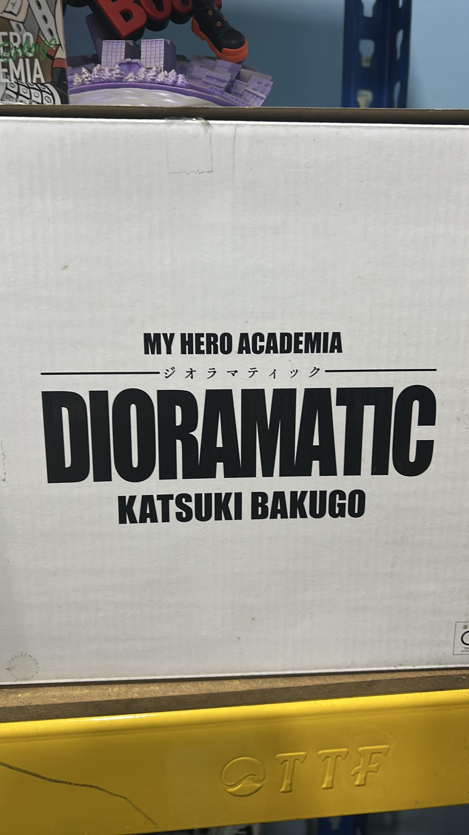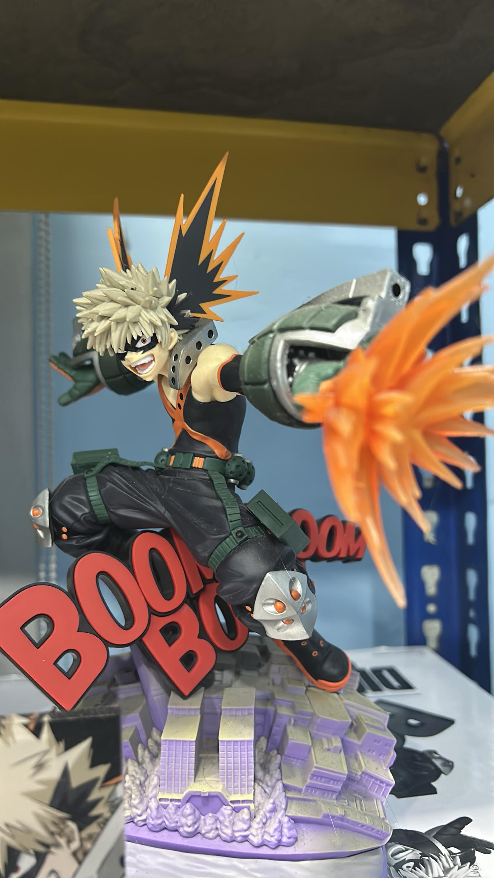 Detailed dioramic figure of Katsuki Bakugo from My Hero Academia, featuring dynamic pose with explosive effects and cityscape base. Comes with original packaging. A must-have collectible for fans of the series and action hero figures.