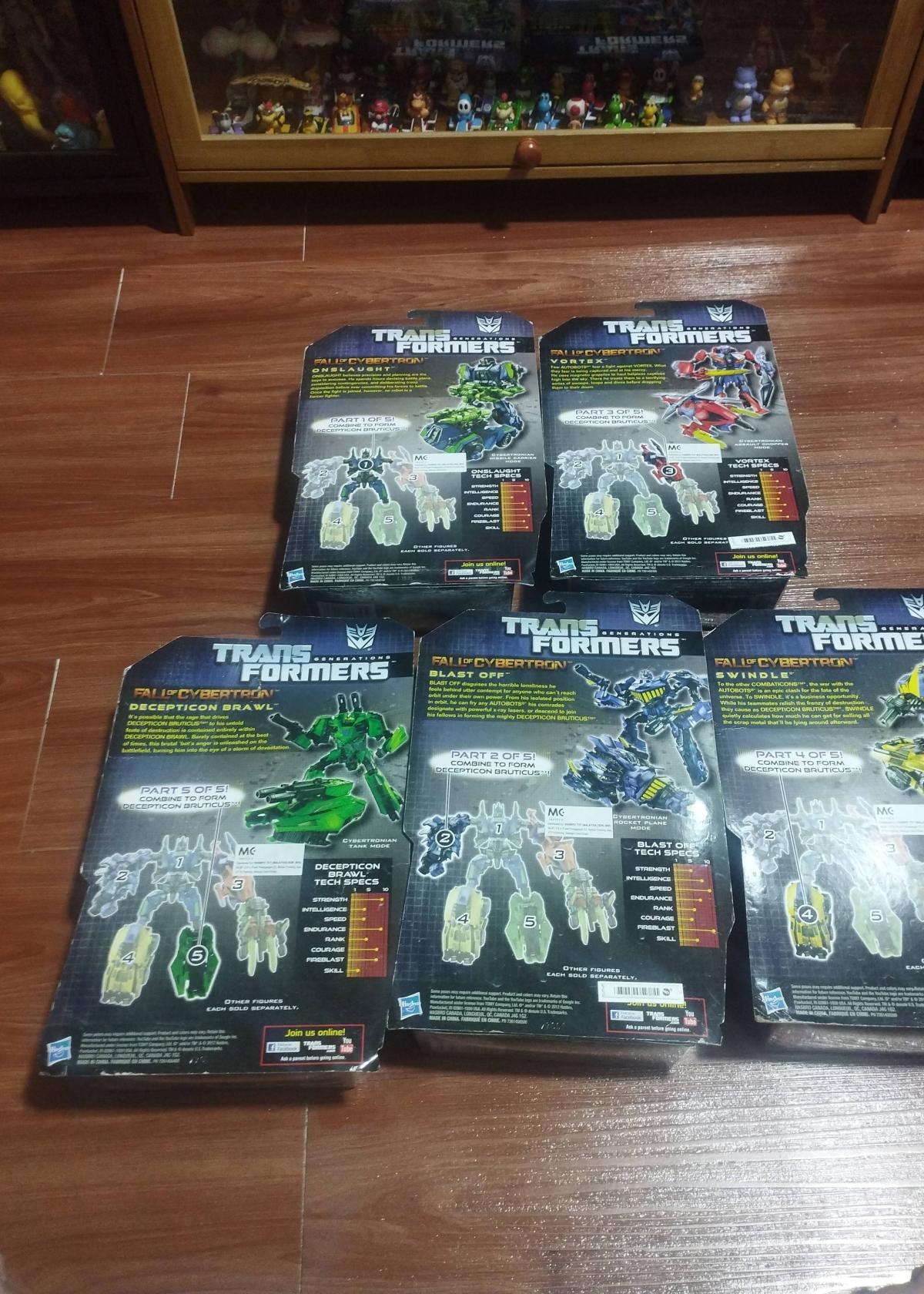 This collectible set features five Transformers Generations Fall of Cybertron action figures: Blast Off, Decepticon Brawl, Onslaught, Swindle, and Vortex. Each figure is factory sealed in its original packaging, showcasing the Combaticons team famed for their ability to combine into the powerful robot Bruticus.