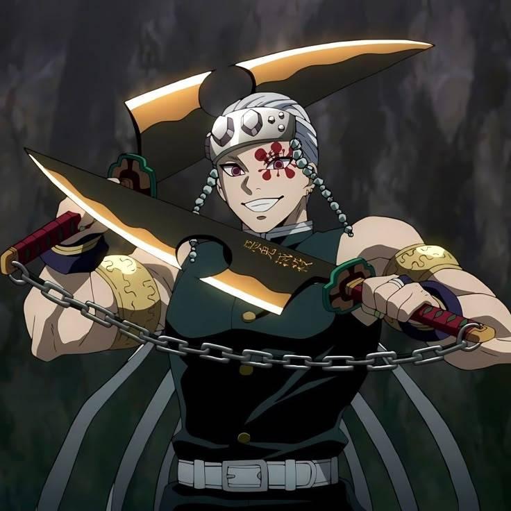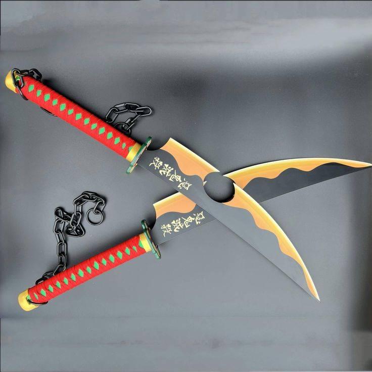 Set of replica Nichirin blades belonging to Tengen Uzui, a character from the anime Demon Slayer (Kimetsu no Yaiba). The swords feature distinctive red and green handles with black chains and gold-edged blades adorned with Japanese inscriptions. Ideal for collectors and cosplay enthusiasts. You will get 2 pcs of blade including set of bag. The material is Solid Metal and tier 1 in our class.