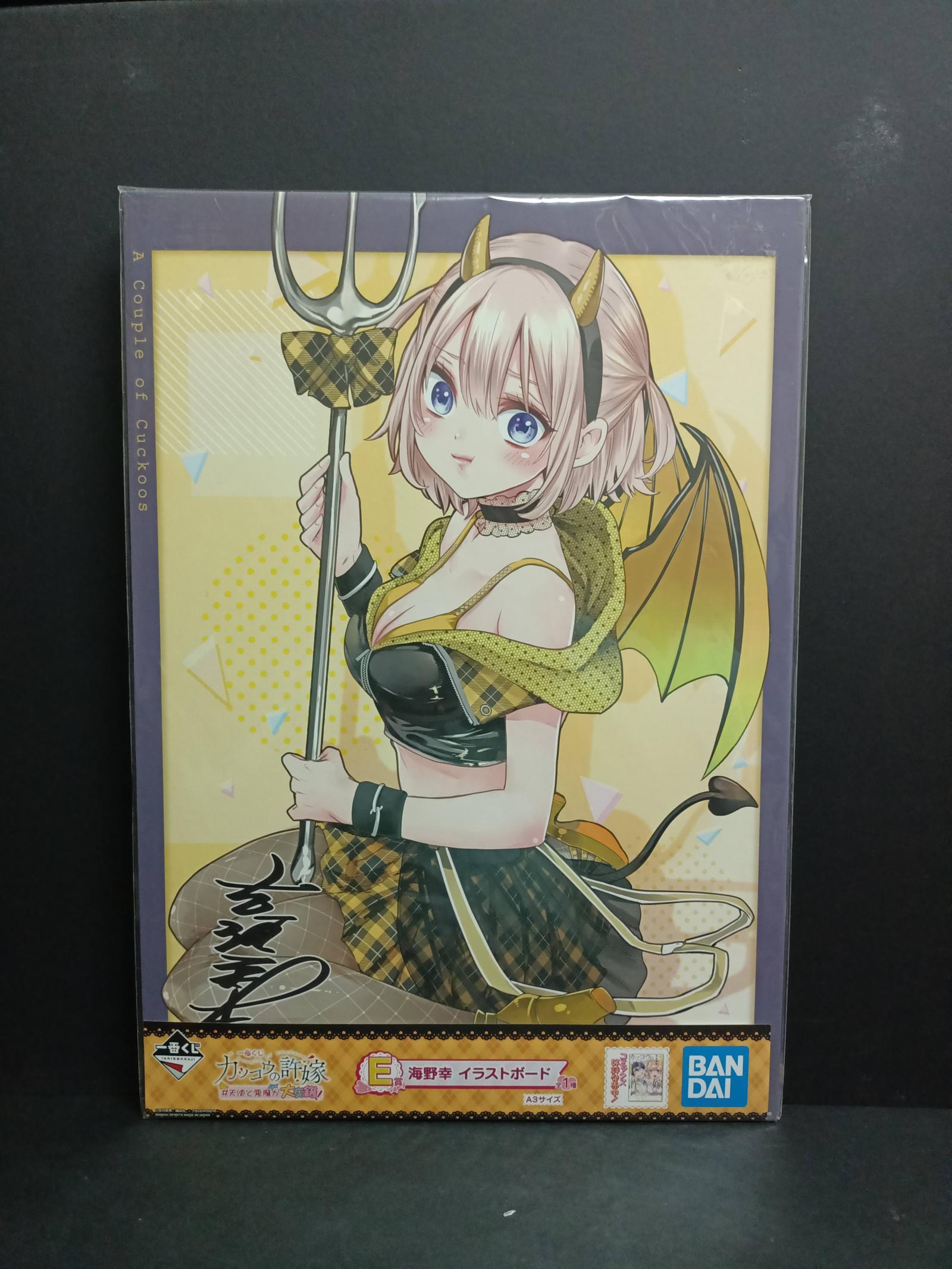 A collectible A3-sized illustration board featuring Sachi Umino (海野 幸) as a devil girl with horns, wings, and a trident for series's Angels & Demons Intersect! lineup. Official Bandai product from the A Couple of Cuckoos (カッコウの許嫁) series. The board is sealed in its original packaging, showcasing vibrant artwork and Japanese text indicating it as the E Prize. Perfect for anime art collectors and fans of the A Couple of Cuckoos (カッコウの許嫁) series.