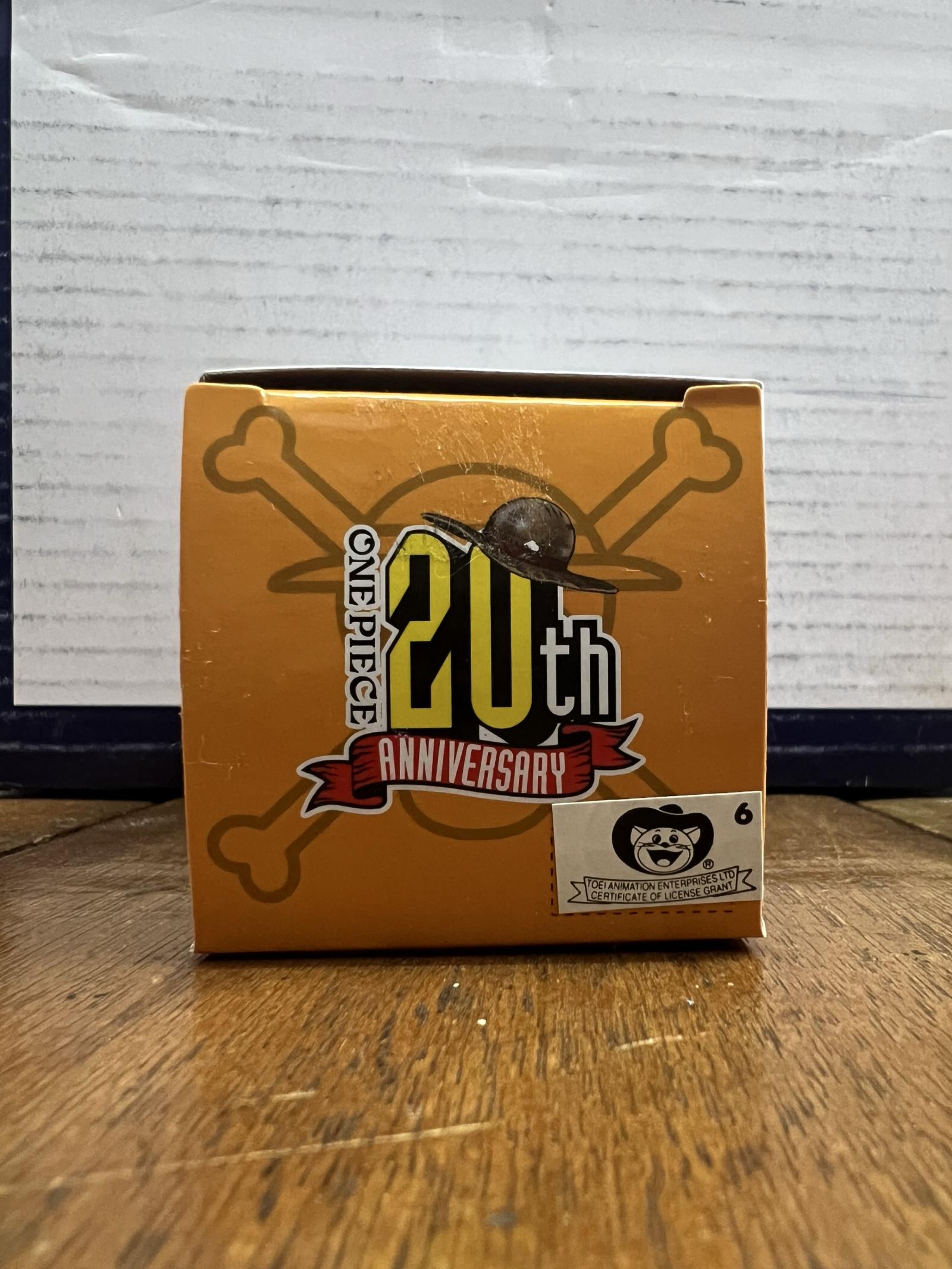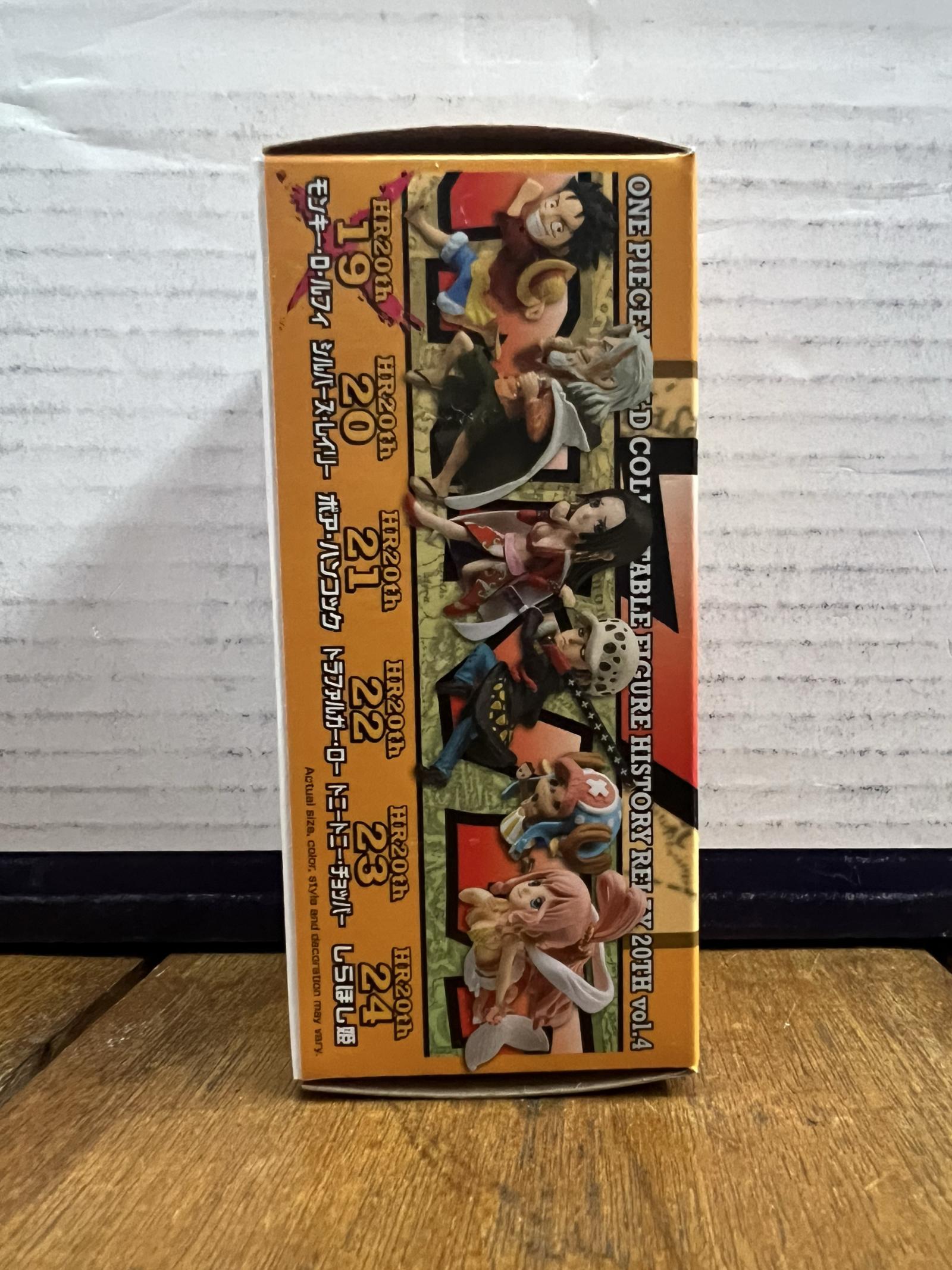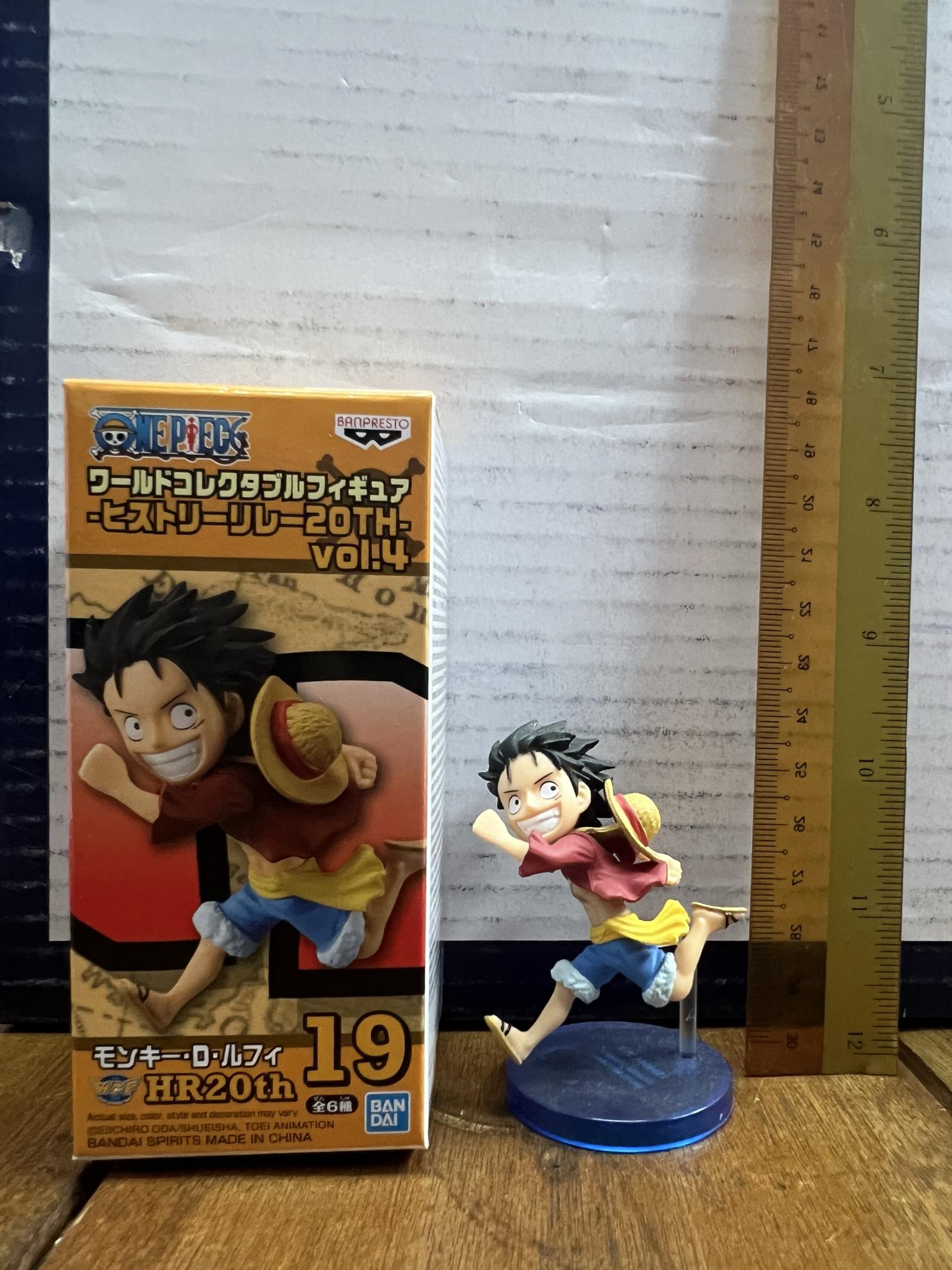 A collectible Monkey D. Luffy figure from Banpresto's One Piece World Collectable Figure History Relay 20th Vol.4 series. This figure is number 19 in the series, featuring Luffy in a dynamic running pose, wearing his iconic straw hat, red shirt, and blue shorts. The figure comes with its original box, which shows some signs of storage wear but remains intact.