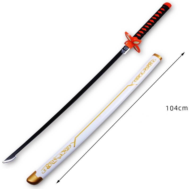 A high-quality replica of Shinobu Nichirin Blade from the popular anime Demon Slayer. The sword features a black blade with the distinctive red and black handle, accompanied by a white sheath decorated with gold accents. Measuring approximately 104 cm in length, this collectible is perfect for fans and cosplay enthusiasts.