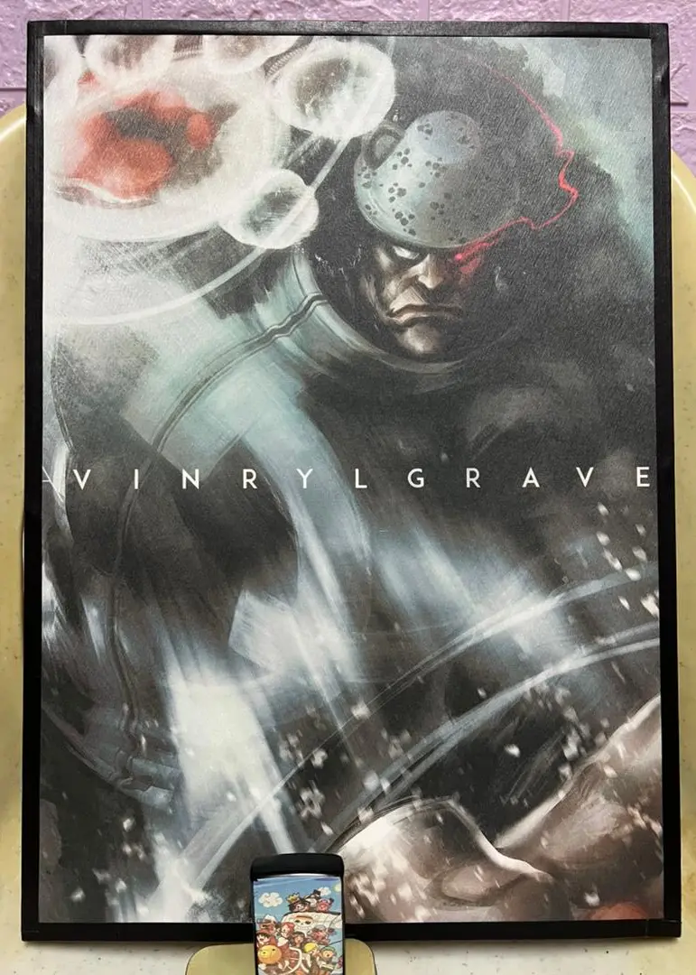 This near-mint condition art print features Bartholomew Kuma, a notable character from the popular anime series One Piece. The print is part of the Vinryl Grave collection, known for its dark and intense artistic style, capturing Kuma's powerful and mysterious aura.