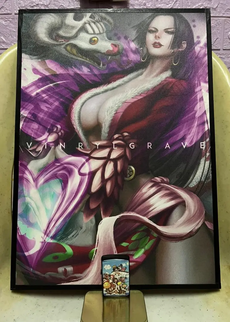 This art print features Boa Hancock, a popular character from the acclaimed anime and manga series One Piece. Produced by Vinryl Grave, known for their vibrant and detailed anime artwork, this print captures the elegance and power of Boa Hancock with striking colors and intricate design elements. The art is presented in a sleek wooden frame, enhancing its display value.