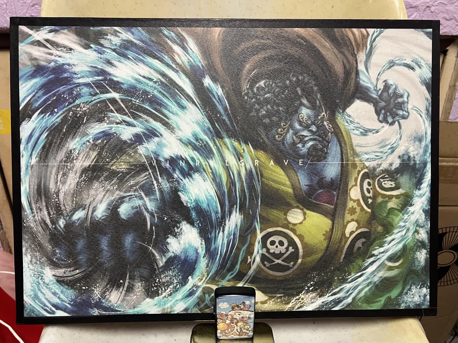 This near mint condition vinyl art print features Jinbei, the formidable Sea Knight from the acclaimed anime 'One Piece,' captured in an impressive dynamic oceanic scene. The artwork is vibrant and detailed, rendered with great craftsmanship to highlight the character's strength and presence.