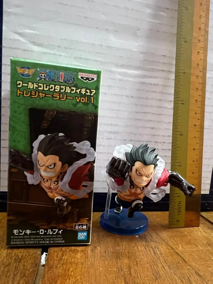 The One Piece World Collectable Figure (WCF) series by Banpresto features detailed, small-scale figures of characters from the popular anime and manga series, One Piece. The Monkey D. Luffy Gear 4 figure captures Luffy in his dynamic Gear Fourth transformation, showcasing intricate sculpting and vibrant paintwork that highlights his determined expression, distinctive scar, and iconic tattoos. This figure is part of the WCF Treasure Rally IV collection, released as a limited and exclusive item in December 2021. Standing approximately 65mm tall, it is made from high-quality ABS and PVC materials, ensuring durability and a premium feel. The figure comes with a clear stand and a vibrant blue base, enhancing its display presence. Ideal for One Piece fans and collectors of anime figures, this piece brings energetic character and craftsmanship to any collection.
