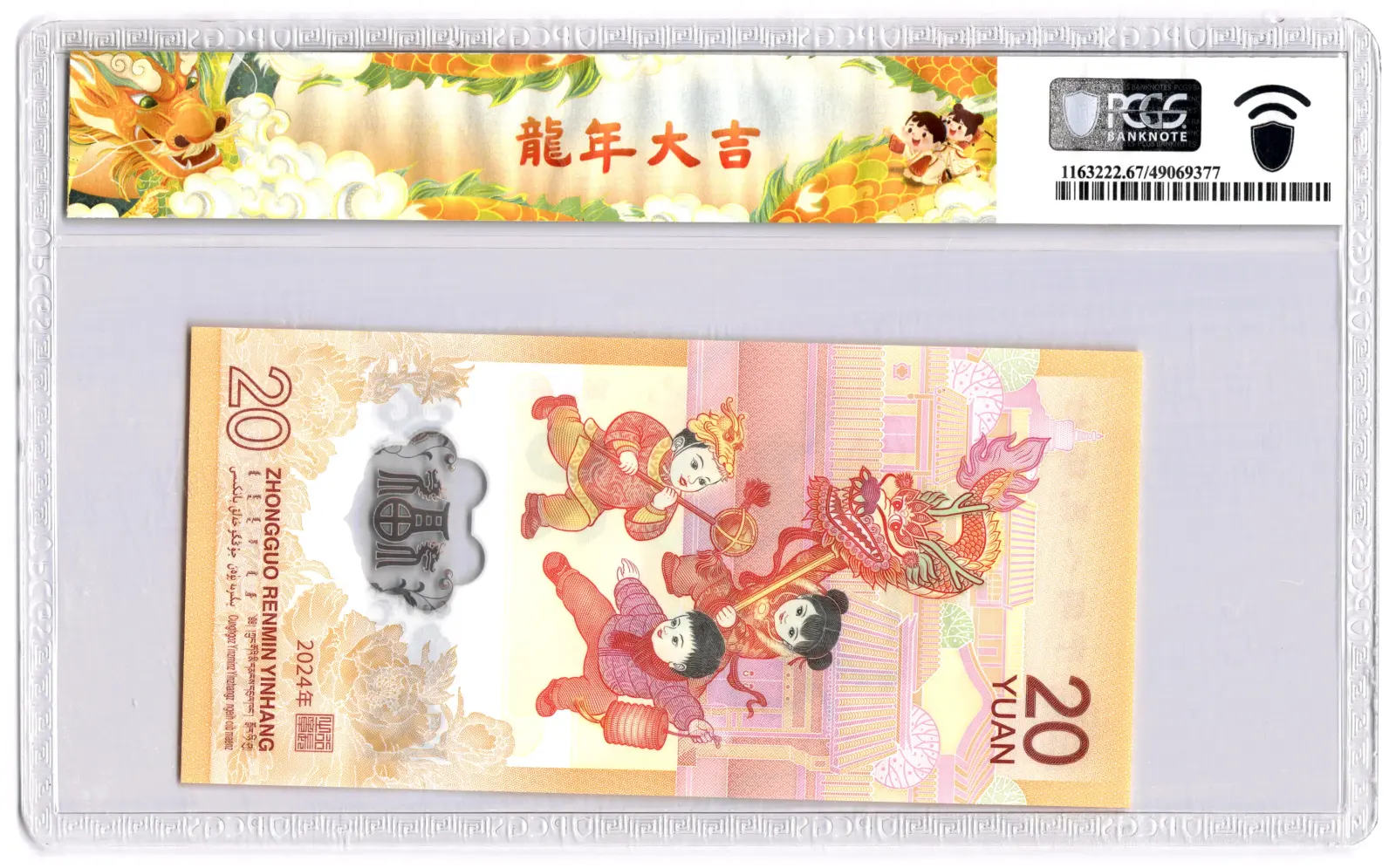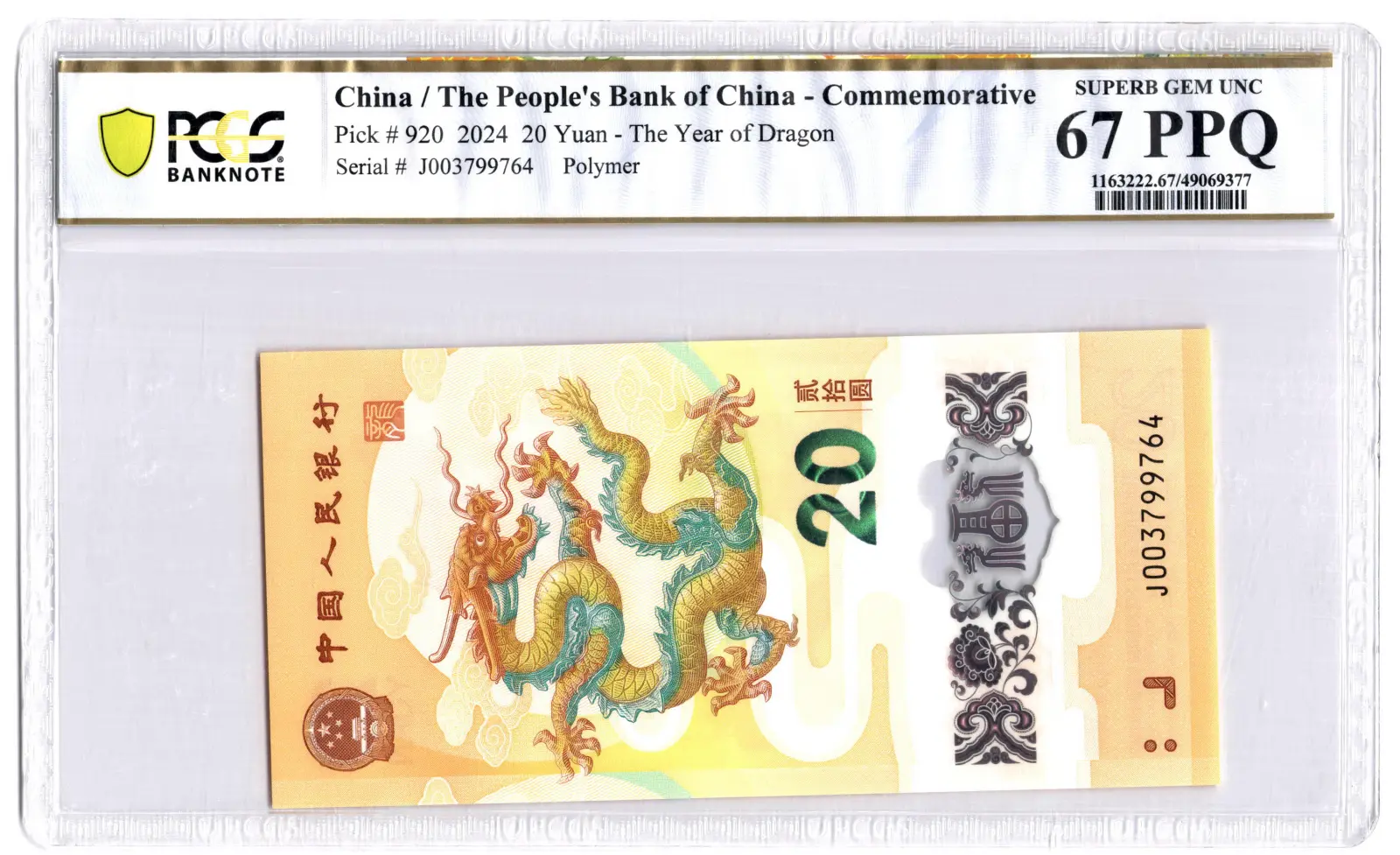 PCGS 67PPQ Graded J003799764 China 20 Yuan 2024 P#920 Polymer Banknote The Year Of Dragon Superb UNC