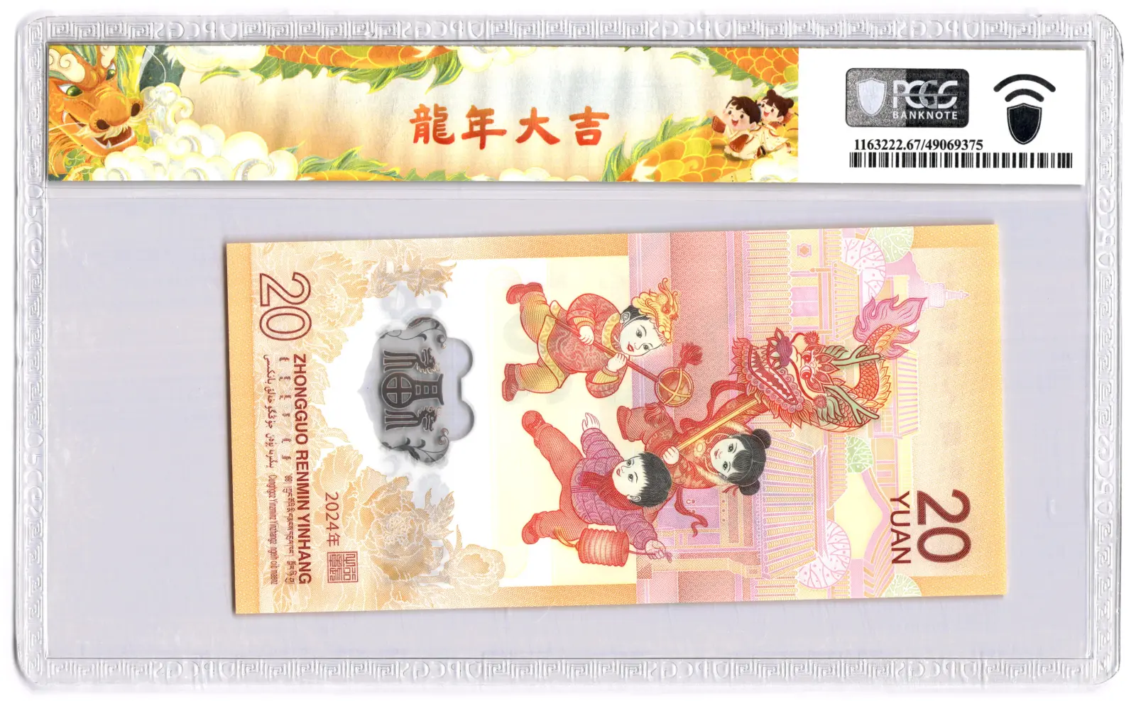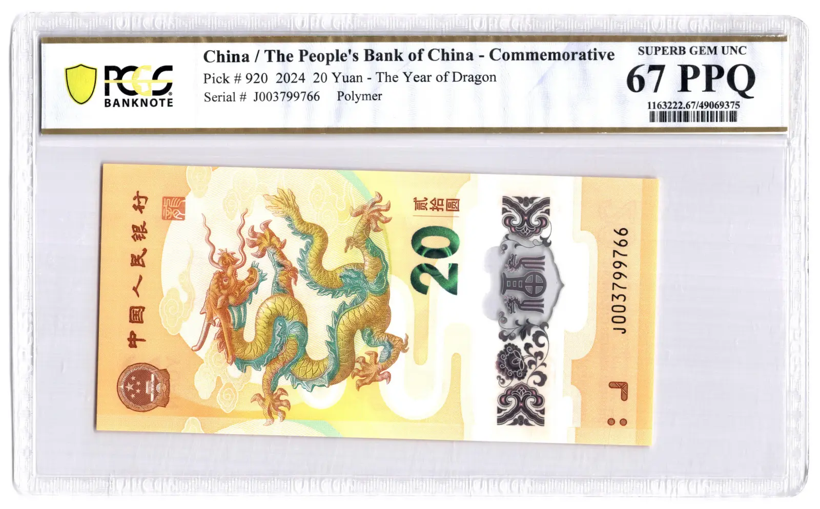 PCGS 67PPQ Graded J003799766 China 20 Yuan 2024 P#920 Polymer Banknote The Year Of Dragon Superb UNC