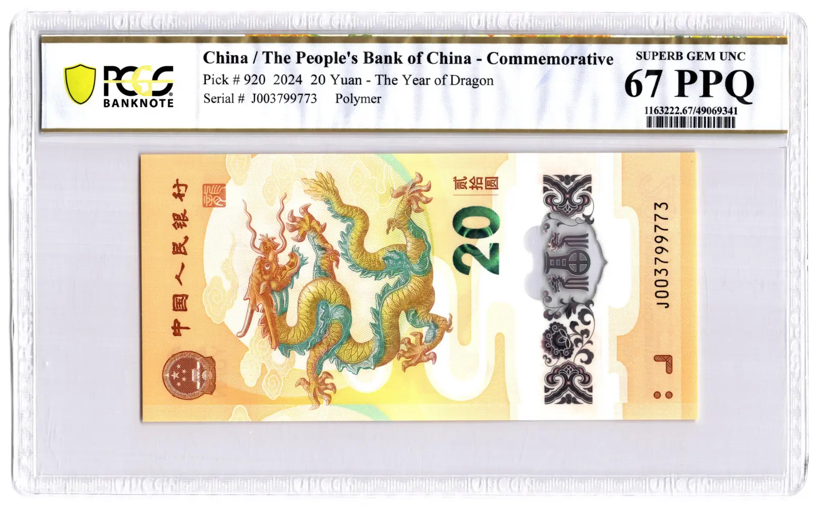 PCGS 67PPQ Graded J003799773 China 20 Yuan 2024 P#920 Polymer Banknote The Year Of Dragon Superb UNC