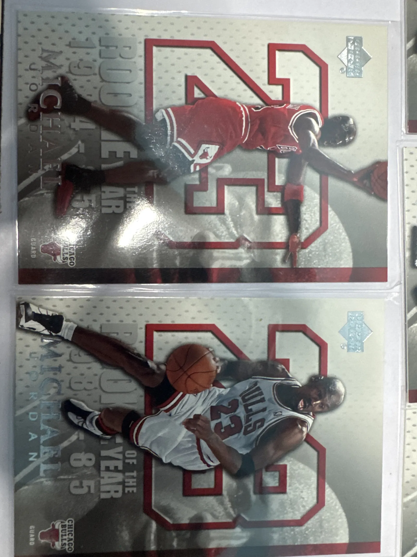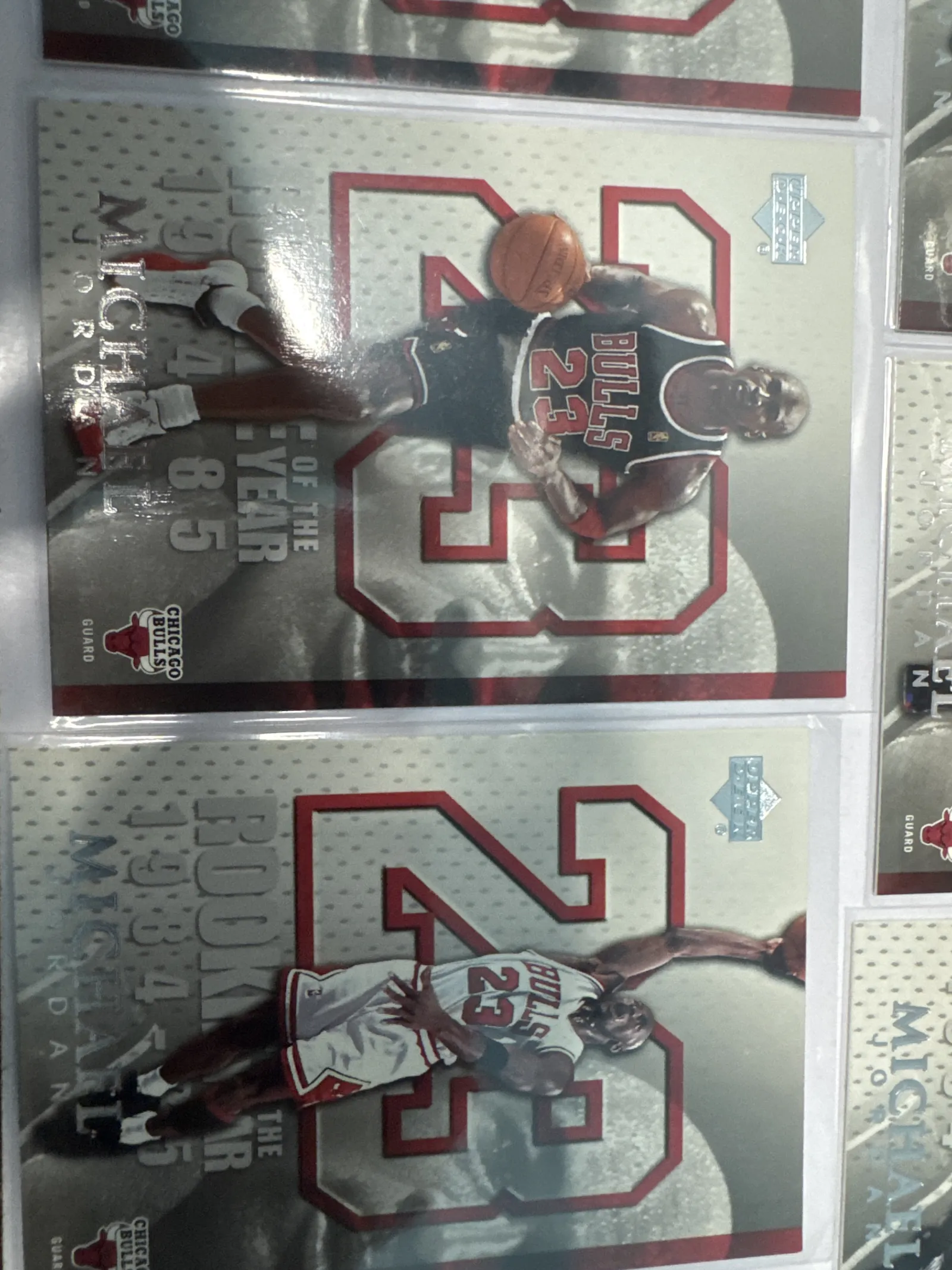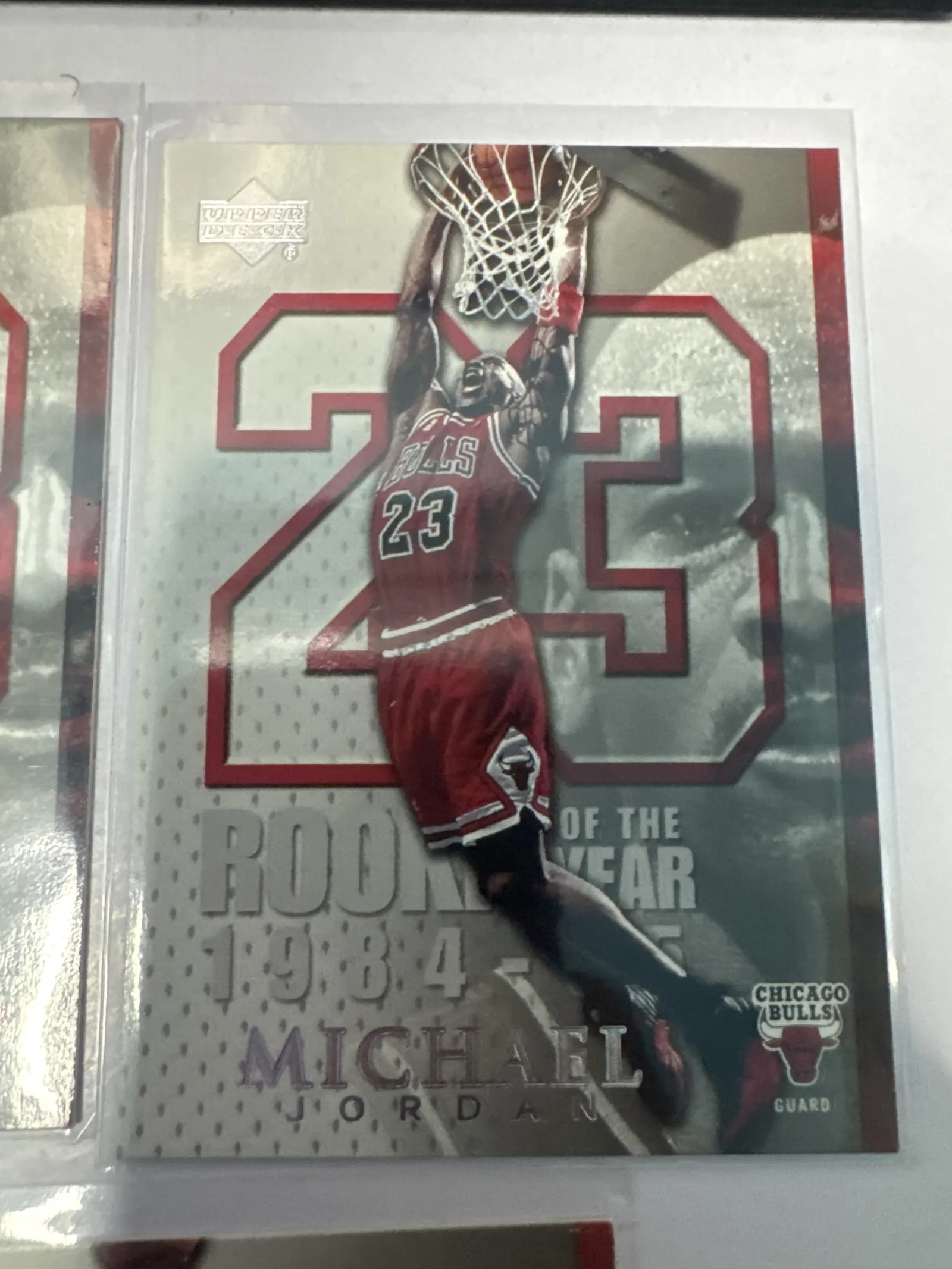 Total of 9 copies in Lot for sales.Official 1985 Upper Deck Michael Jordan Rookie of the Year basketball card featuring Jordan in Chicago Bulls uniform with iconic #23. Card shows minor surface reflections and slight edge wear visible through plastic protective sleeve.