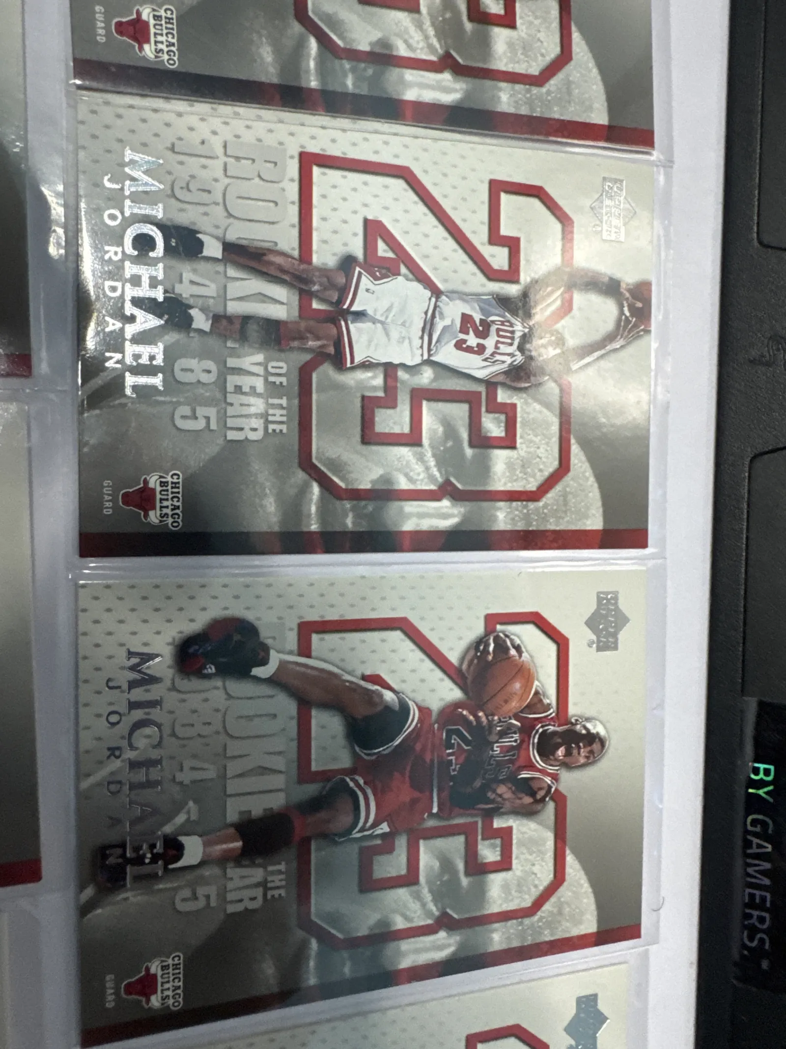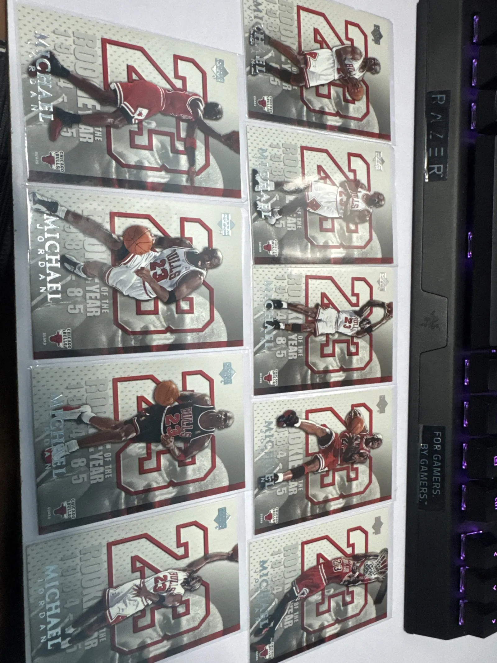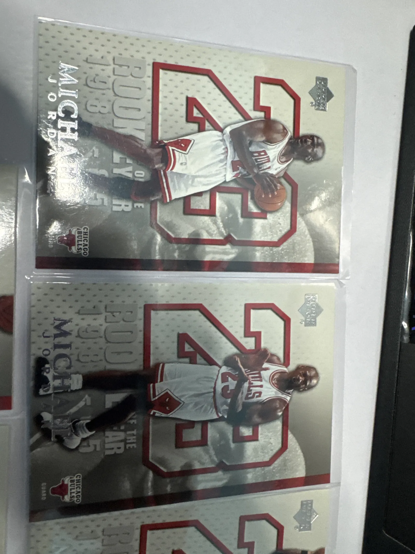 Total of 9 copies in Lot for sales.Official 1985 Upper Deck Michael Jordan Rookie of the Year basketball card featuring Jordan in Chicago Bulls uniform with iconic #23. Card shows minor surface reflections and slight edge wear visible through plastic protective sleeve.