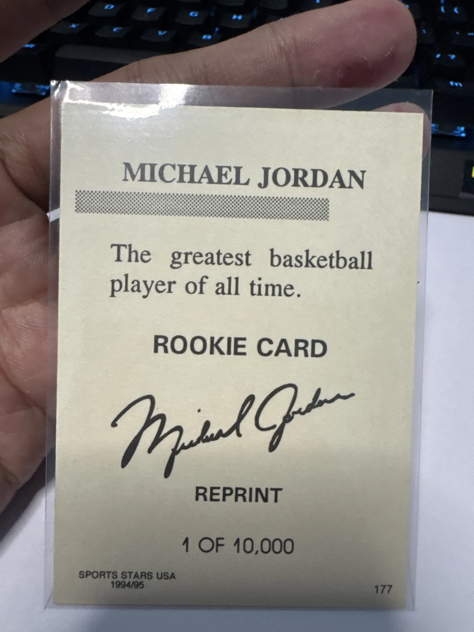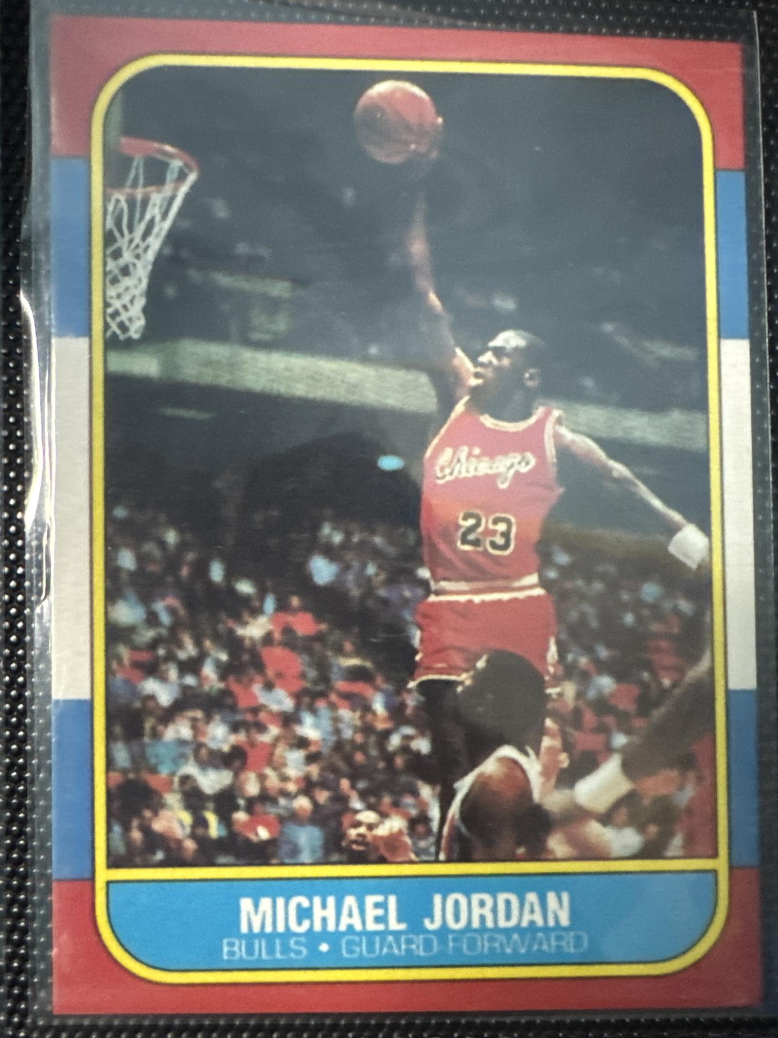 This is reprinted version.This classic 1986 Michael Jordan basketball card features the Chicago Bulls guard forward in mid-air during a game. The card displays vibrant colors with minor edge wear and is protected in a plastic sleeve. A must-have collectible for basketball and Michael Jordan fans.