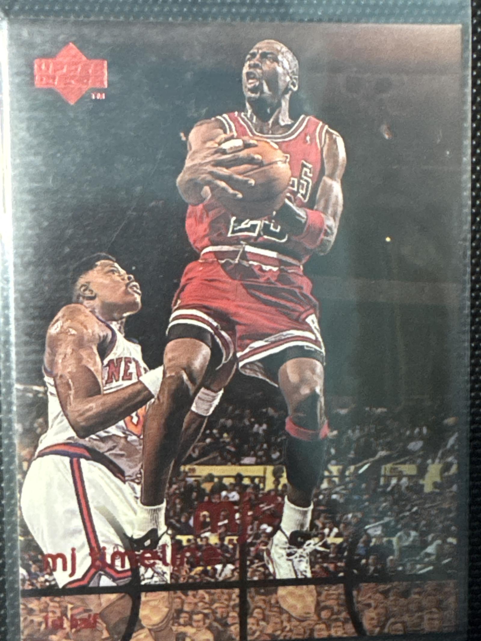 A 1994 Upper Deck basketball card featuring Michael Jordan of the Chicago Bulls in action. The card shows Michael mid-air during a game against a New Jersey Nets player. This collectible card is a great addition for any basketball fan or Michael Jordan enthusiast.