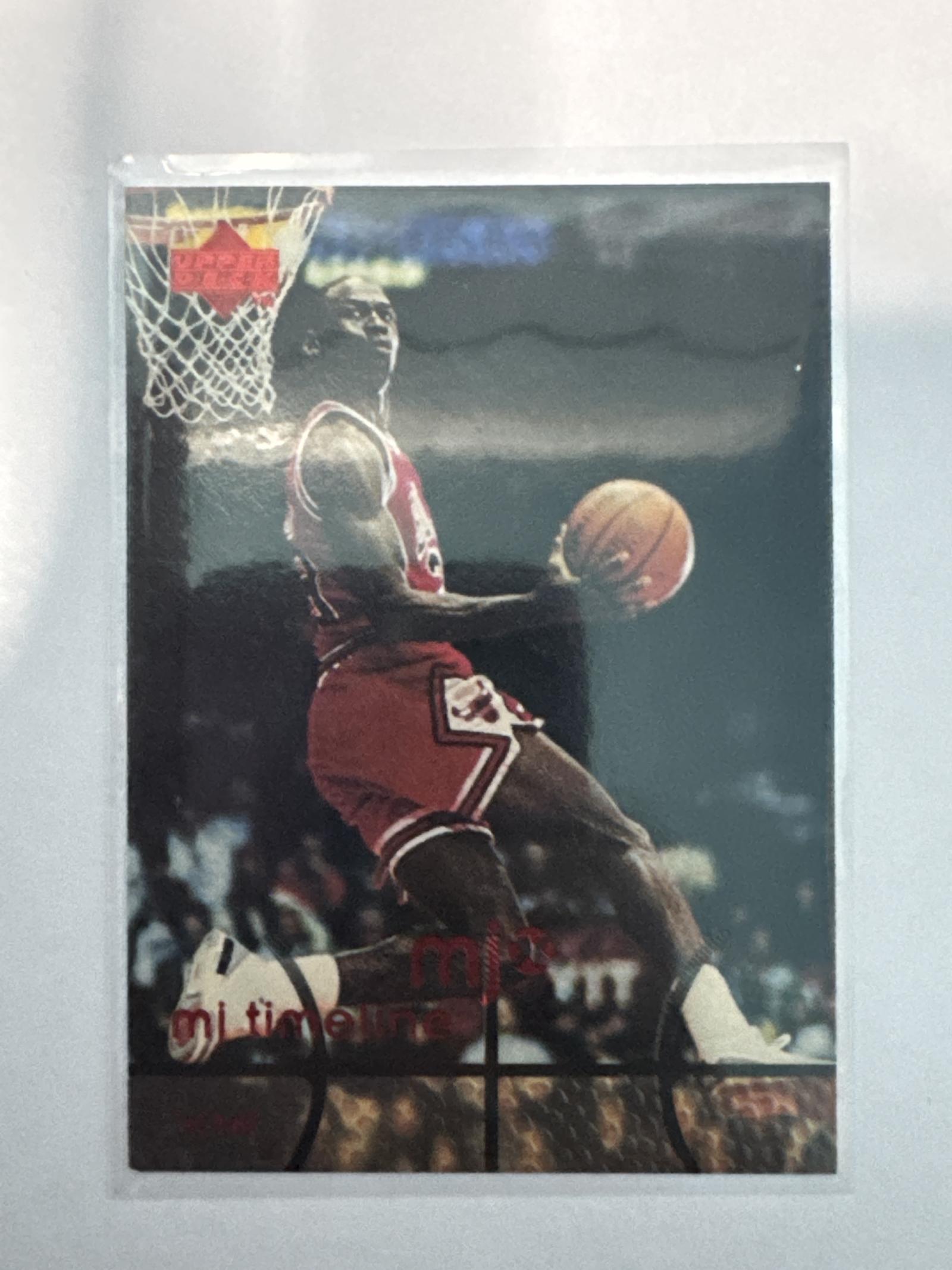A 1995 Upper Deck Michael Jordan basketball card featuring the iconic MJ Timeless design. The card shows Michael Jordan in mid-air with a basketball, wearing his classic Chicago Bulls uniform. The card is protected in a sleeve and shows minor surface wear visible under certain lighting but is overall well-preserved.