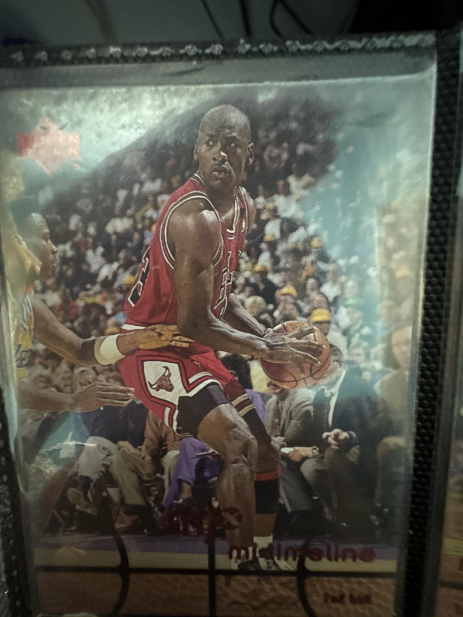 A 1997-98 Upper Deck basketball card featuring Michael Jordan in a Chicago Bulls uniform during a game. The card shows some wear and minor surface scratches but retains vibrant colors and clear imagery.