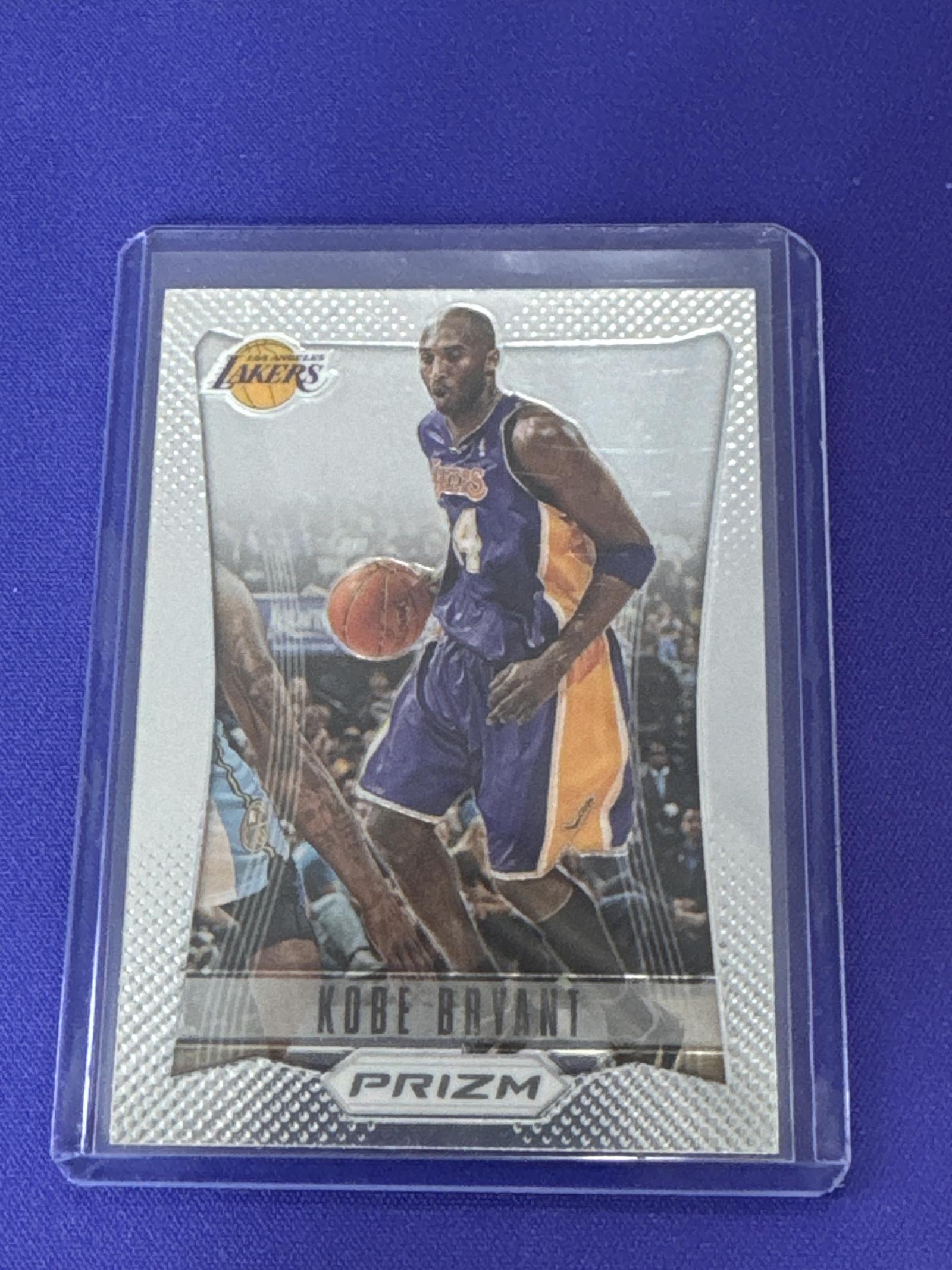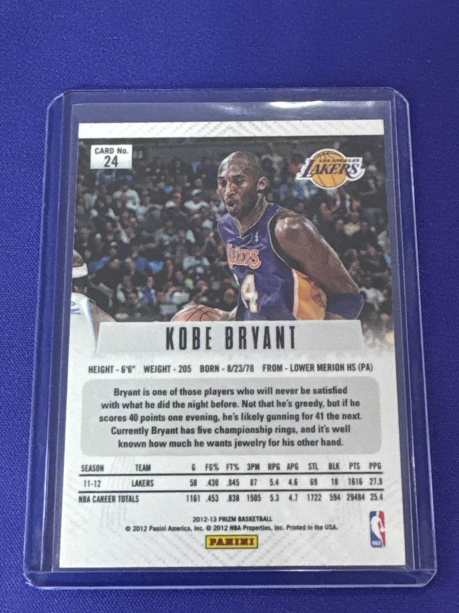This 2012-13 Panini Prizm Kobe Bryant basketball card features the Lakers legend in action. Card number 24 highlights his stats during the 2011-12 NBA season and career totals. It is protected in a plastic sleeve. A great collectible for Kobe Bryant fans and basketball card collectors.