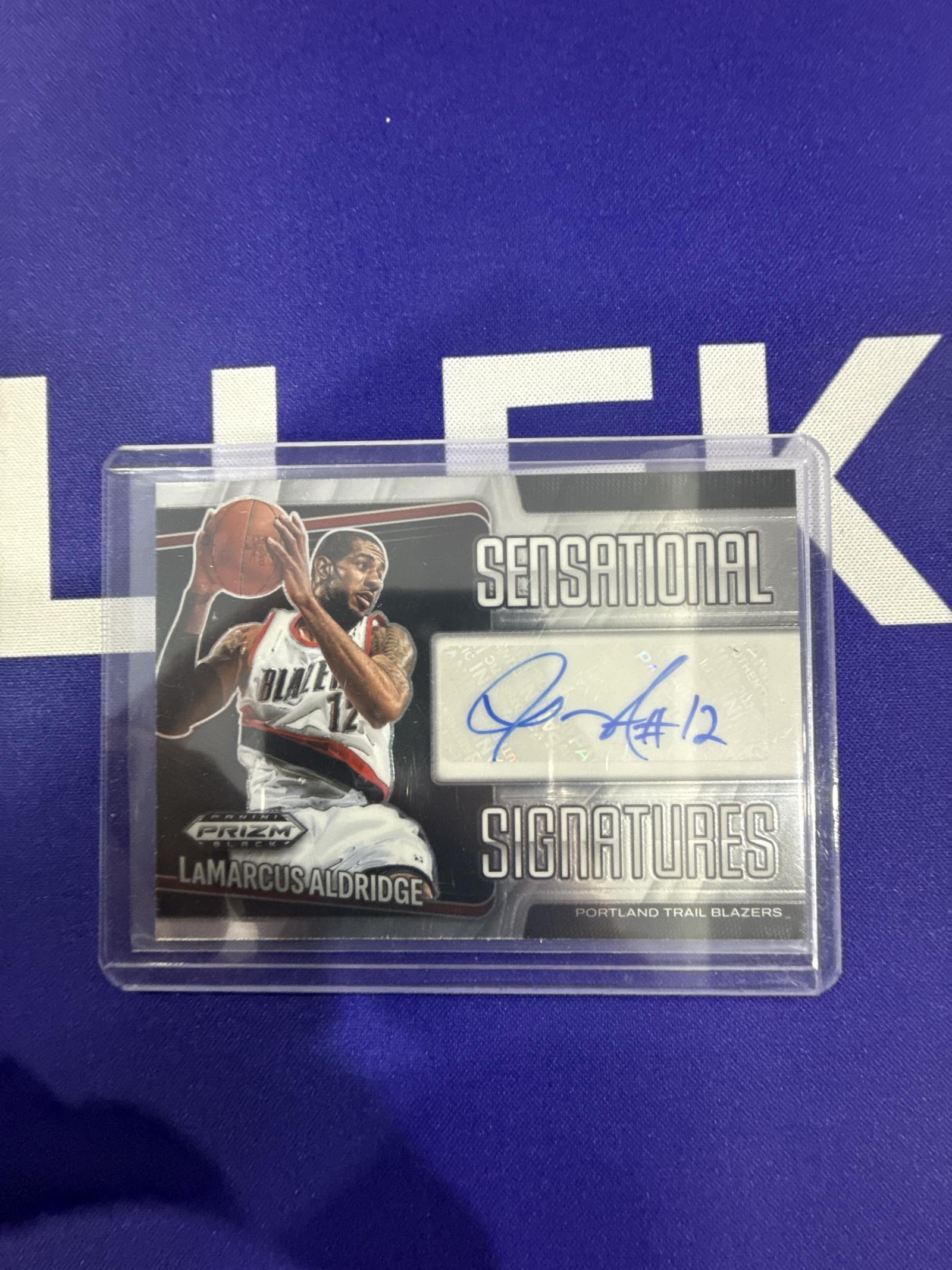 This is a 2012-13 Panini Prizm Sensational Signatures basketball card featuring LaMarcus Aldridge of the Portland Trail Blazers. The card includes a clear, bold autograph and is encased in a protective plastic sleeve. A great collectible for fans and card collectors alike.