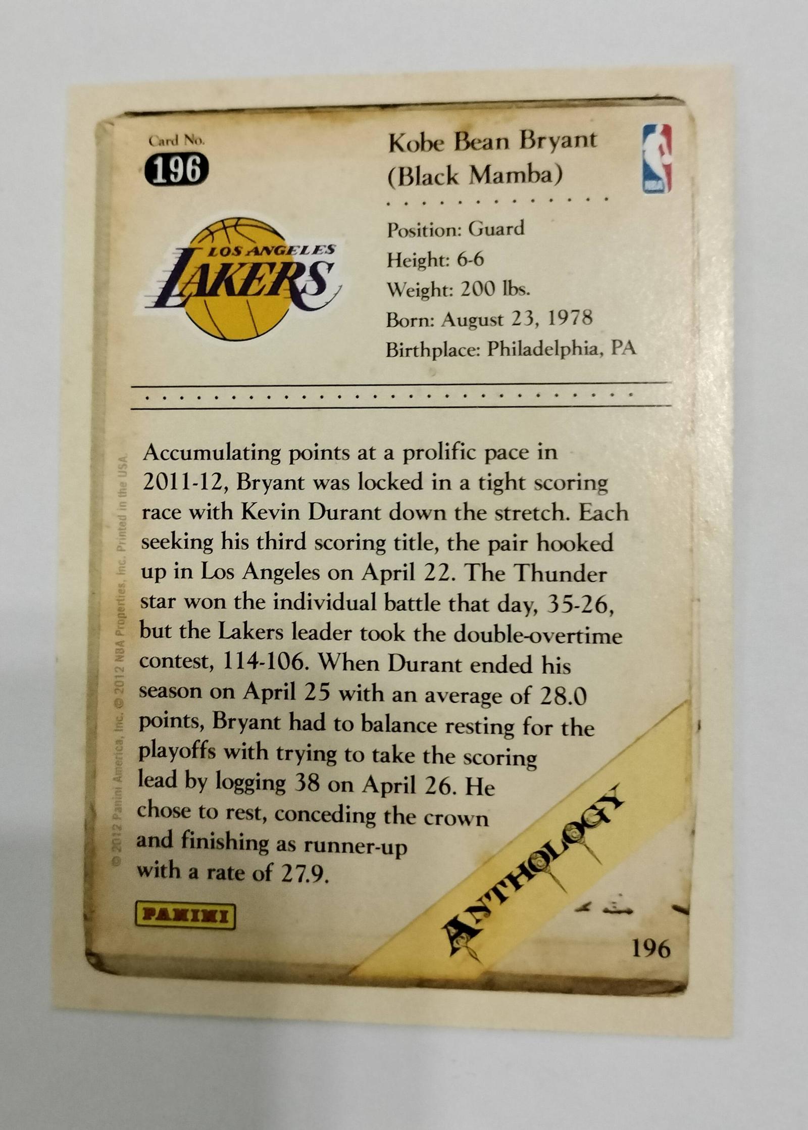 This card features Kobe Bryant in his Los Angeles Lakers uniform, shooting a basketball. It is from the 2012 Panini Anthology set, card number 196. The back of the card highlights Bryant's 2011-12 scoring achievements and provides his player stats. The card shows signs of wear, including corner and edge damage, and slight discoloration, particularly on the back bottom right corner.