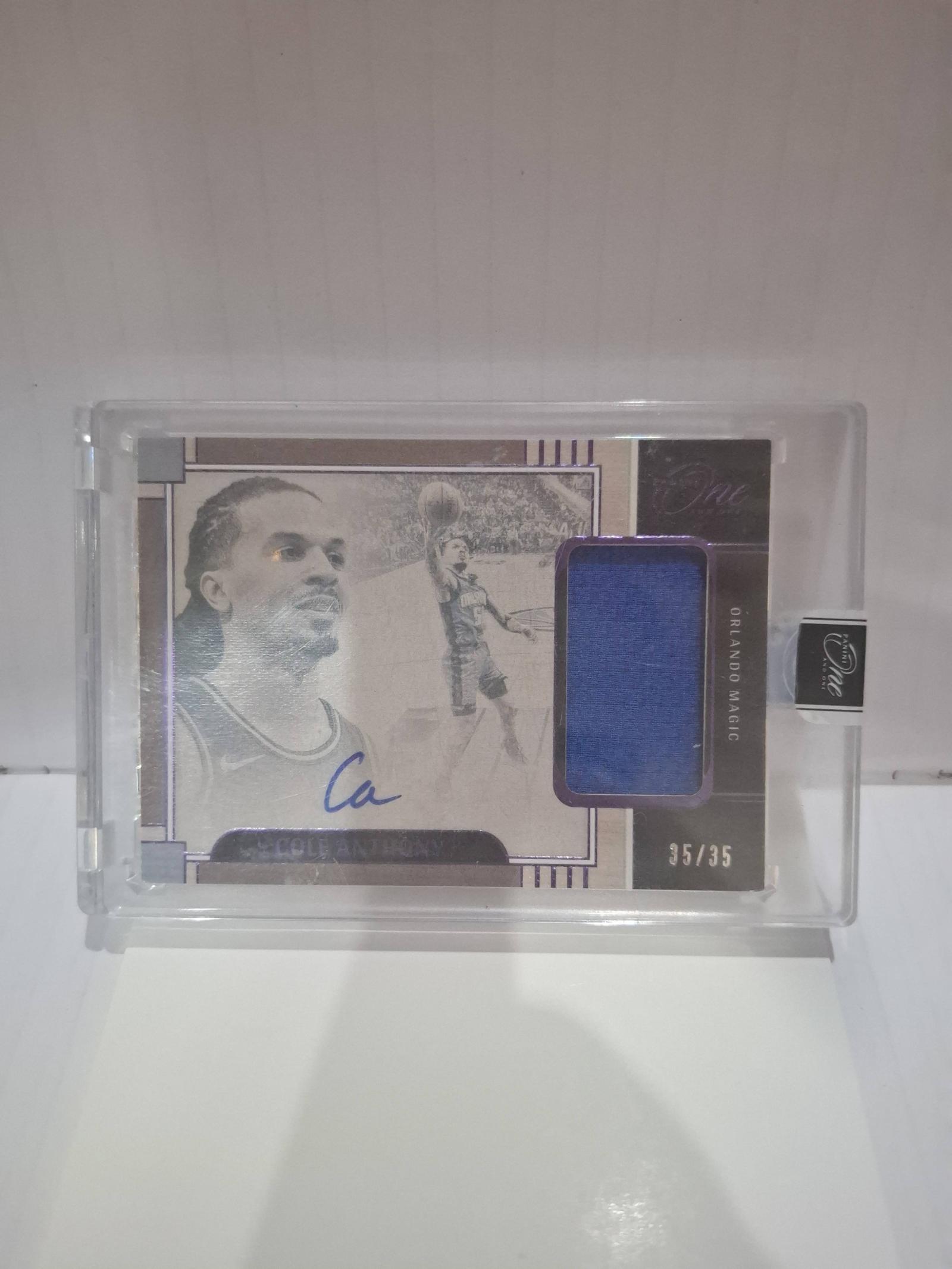 Limited edition Cole Anthony basketball card from the 2014-15 Panini One series. Features an autograph and a blue patch from Orlando Magic memorabilia. Serial numbered 35 out of 35, encased in a protective holder. Great collectible for fans and collectors of Orlando Magic and rookie cards.