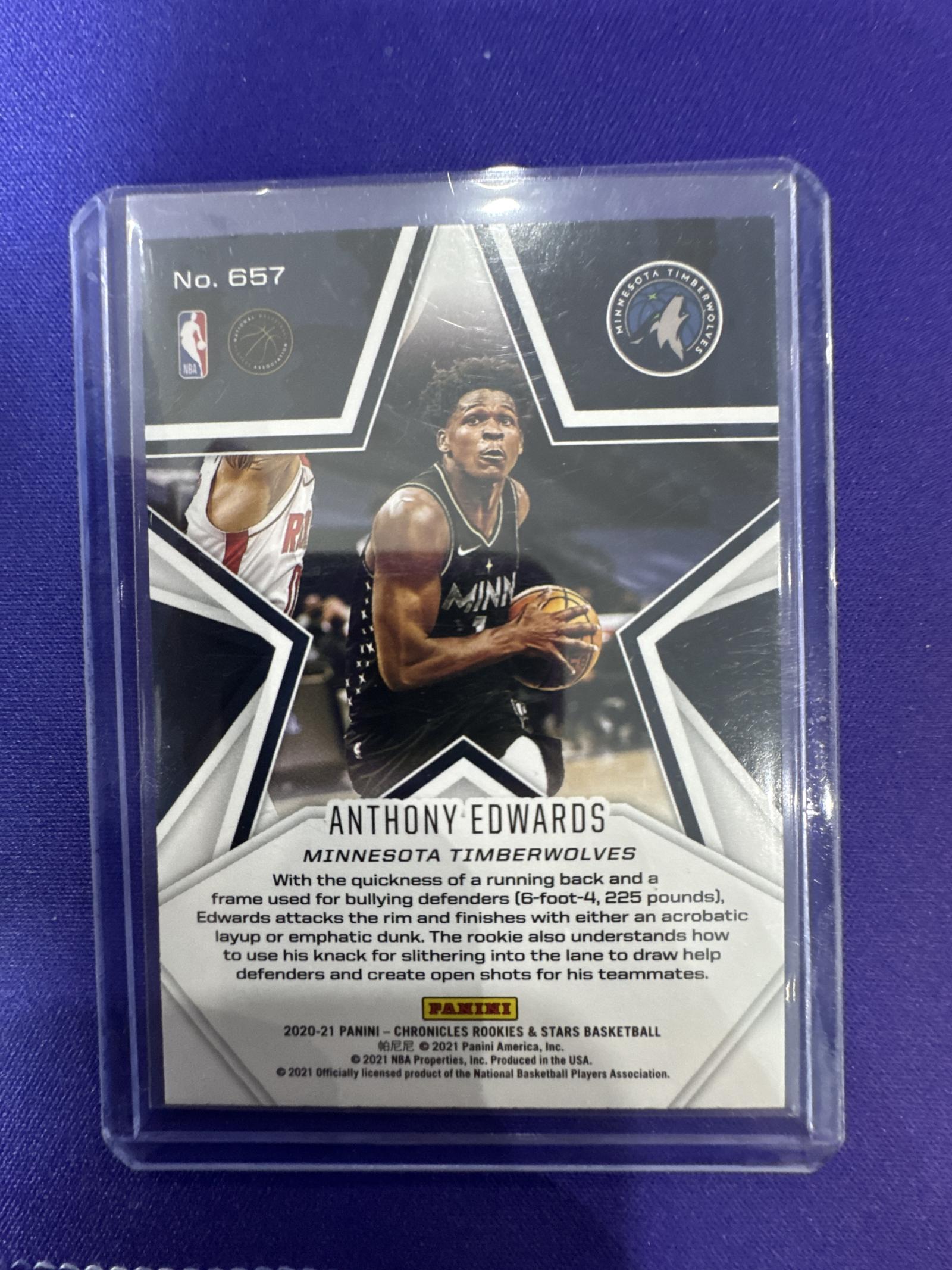 This basketball card features Anthony Edwards of the Minnesota Timberwolves from the 2020-21 Panini Chronicles Rookies & Stars series. It is a rookie card (#657) showcasing Edwards in action on the front within a star design. The back includes a player bio and team details. Card is protected in a plastic sleeve to preserve its condition.