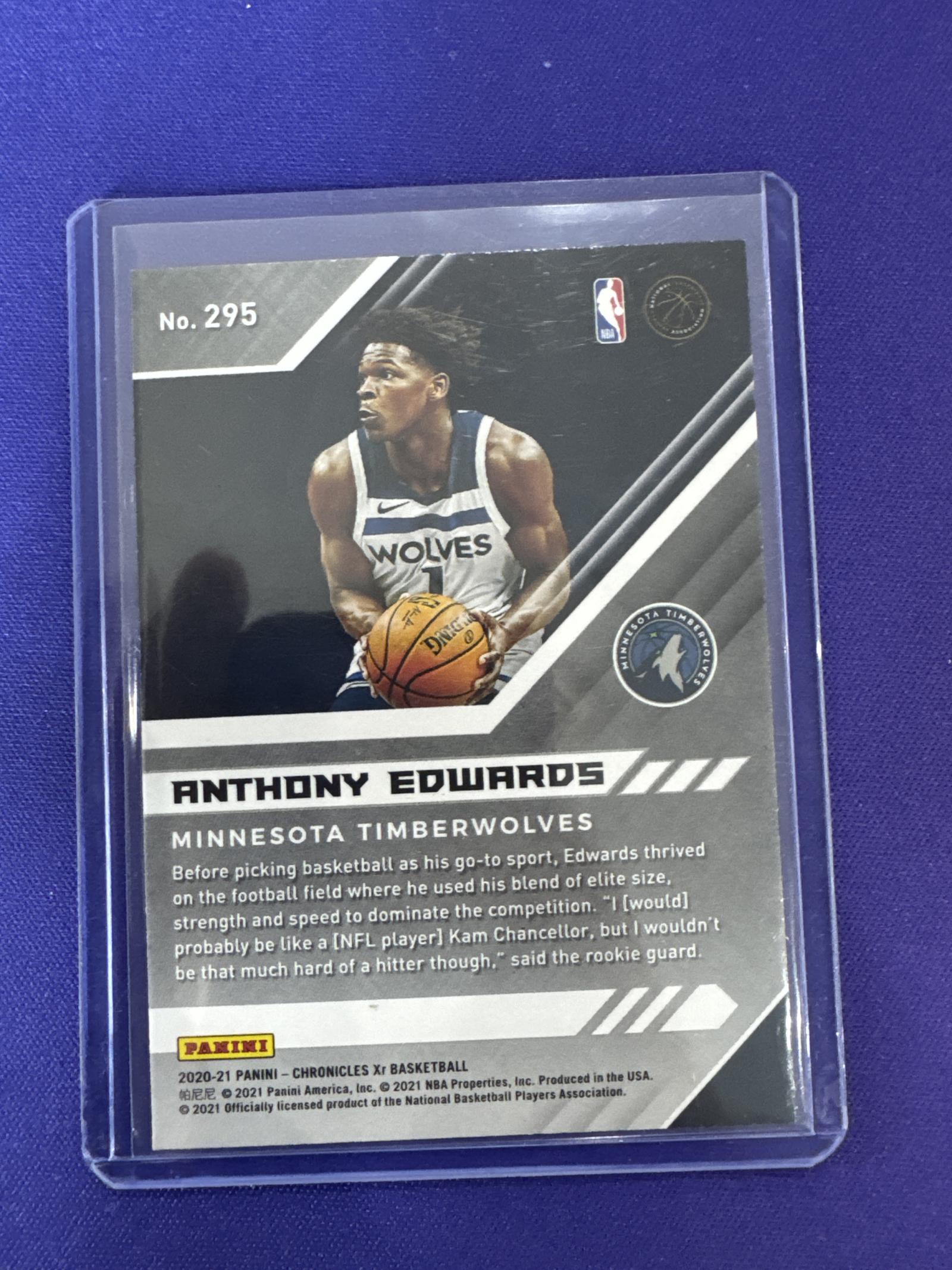 This is a 2020-21 Panini Chronicles Xr basketball rookie card featuring Anthony Edwards of the Minnesota Timberwolves. Card number 295 showcases Edwards in action with a holographic finish. The card is in a protective sleeve, with clean edges and no visible damage, displaying collectible quality.
