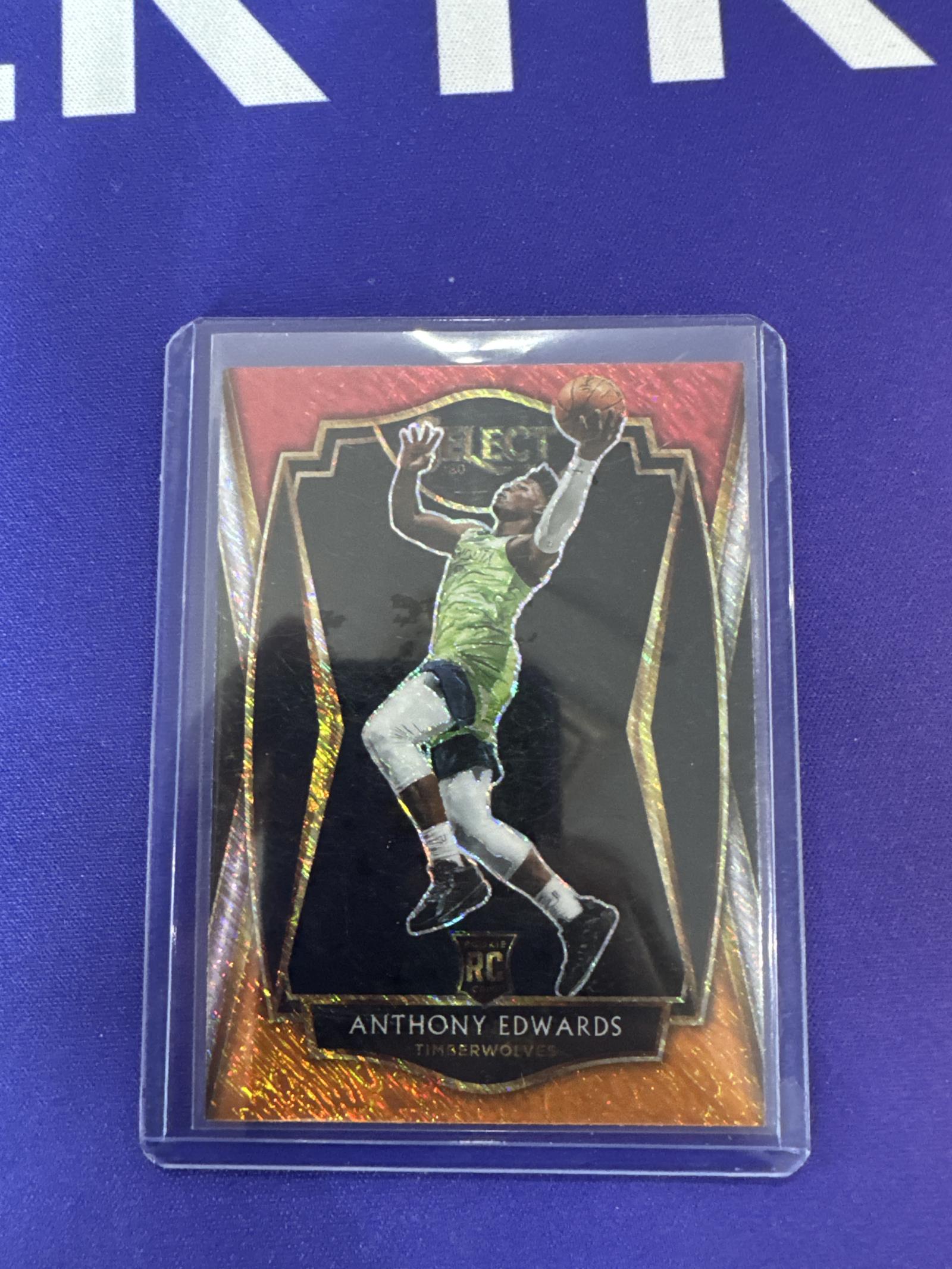 This is a 2020-21 Panini Select Basketball card featuring Anthony Edwards of the Minnesota Timberwolves. It is an Orange Prizm parallel rookie card numbered 169. The card is in a protective sleeve and displays vibrant colors and clear imagery. The back provides a brief player bio and career insight. A great collectible for fans and basketball card enthusiasts.