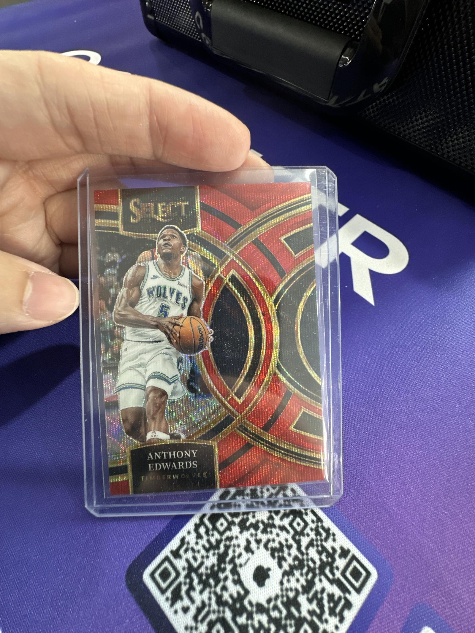 This is a Select basketball card featuring Anthony Edwards in his Minnesota Timberwolves uniform. The card displays vibrant colors and a holographic design with intricate patterns. It is kept in a protective plastic case to preserve its quality. A great addition for collectors and fans of Anthony Edwards and NBA memorabilia.