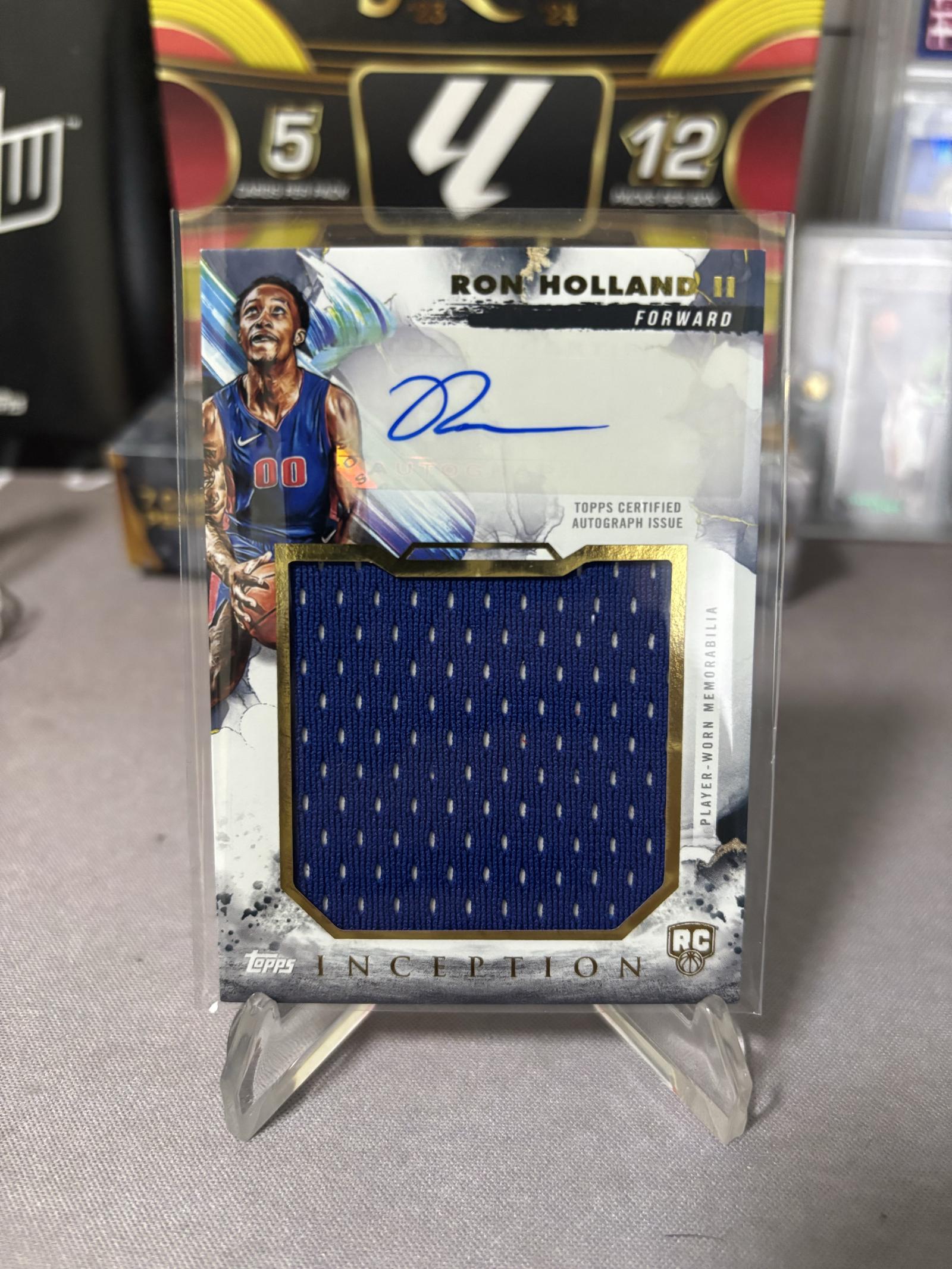This is a 2024-25 Topps Inception basketball card featuring Ron Holland. It includes a certified autograph and a large player-worn jersey patch. The card highlights Holland as a forward and is marked as a rookie card (RC). The card is encased in a protective plastic holder for display.