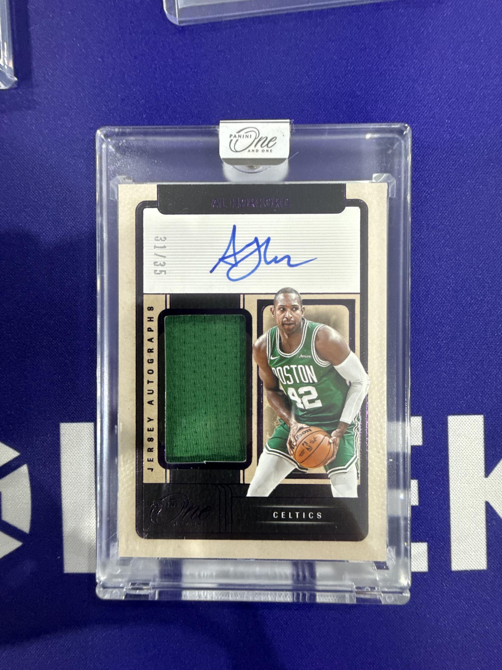 A limited edition Panini One & One basketball card featuring Al Horford of the Boston Celtics. This card includes a genuine game-worn jersey swatch and an autograph, numbered 31 out of 35. Encased in a protective holder to preserve its condition.