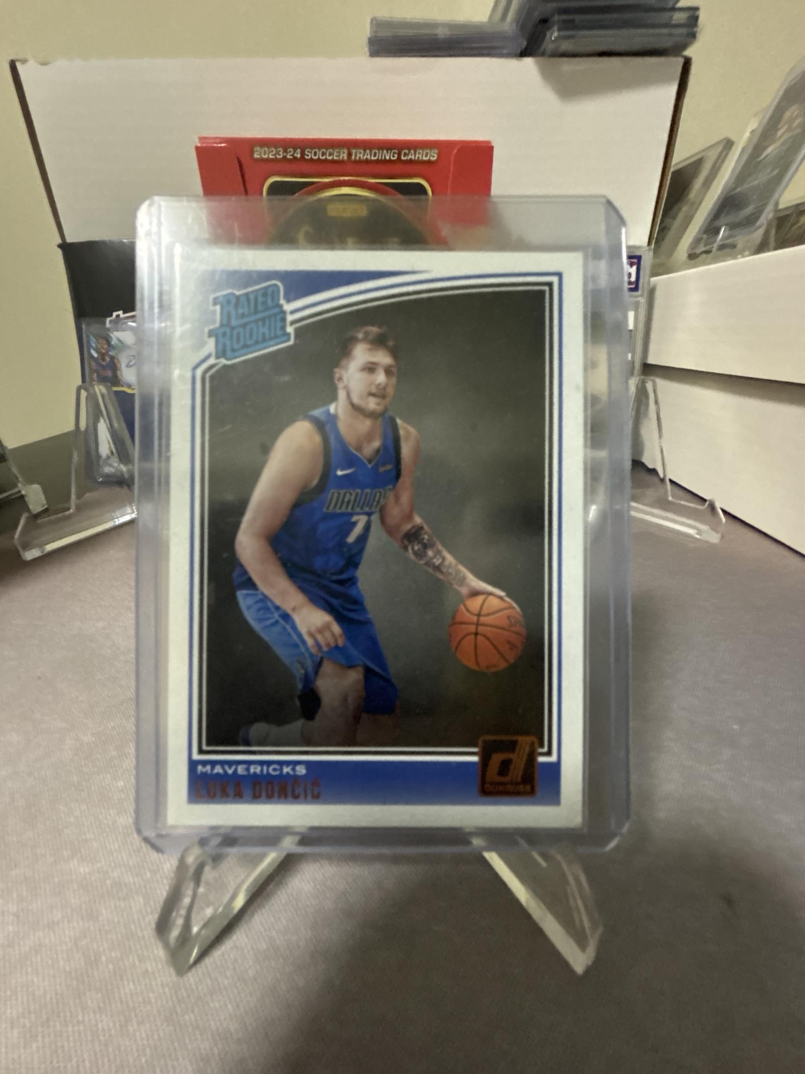 This is a 2021-22 Donruss Rated Rookie basketball card featuring Luka Doncic of the Dallas Mavericks. The card is protected in a plastic sleeve and displayed on a stand. It is a popular collectible for basketball card enthusiasts and fans of Luka Doncic.
