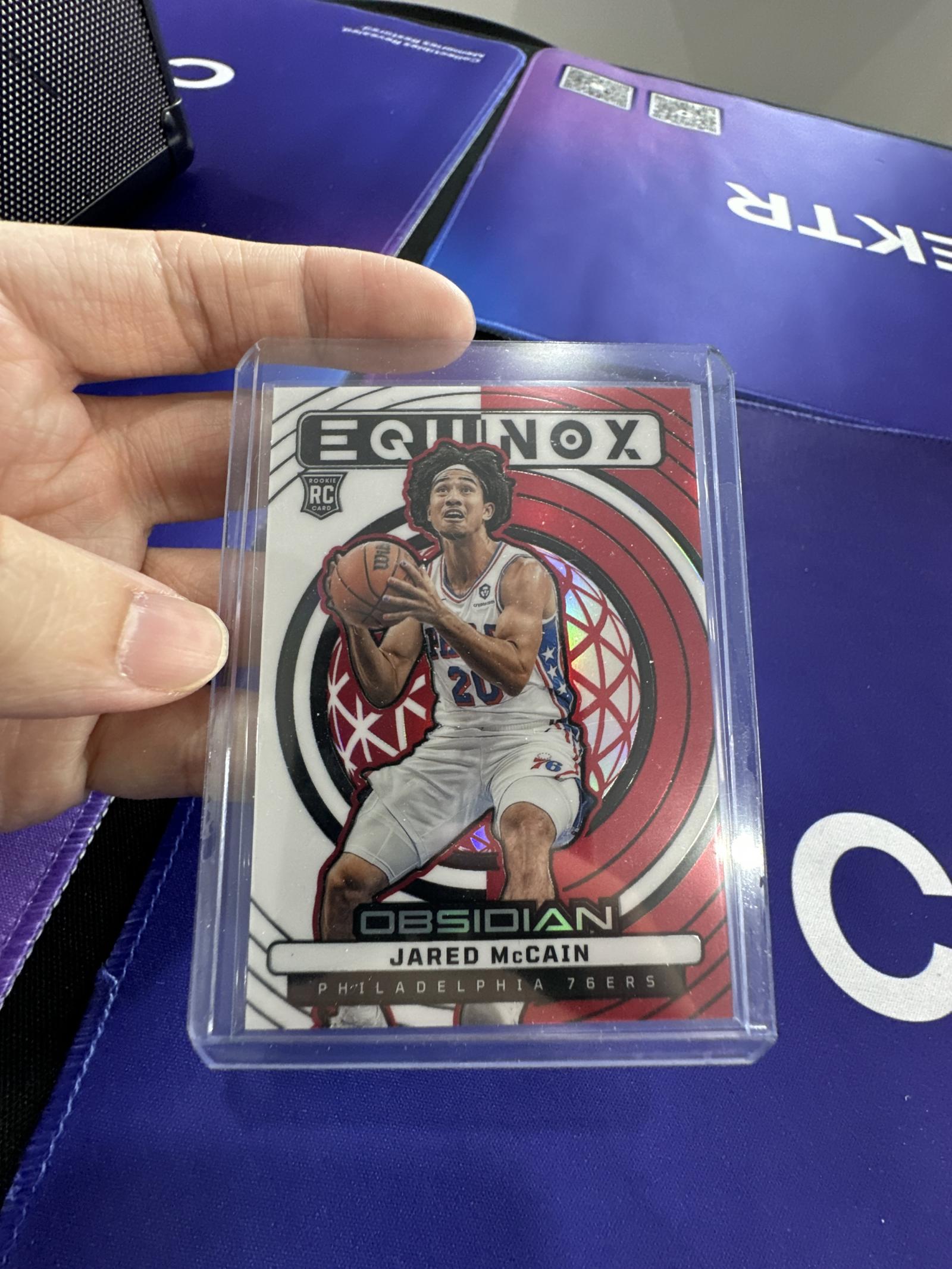 This is a Jared McCain rookie card from the 2021-22 Panini Obsidian series, featuring the Equinox design. The card highlights Jared McCain in his Philadelphia 76ers uniform. It is professionally cared for and kept in a protective plastic sleeve to preserve its condition, ideal for collectors and fans.