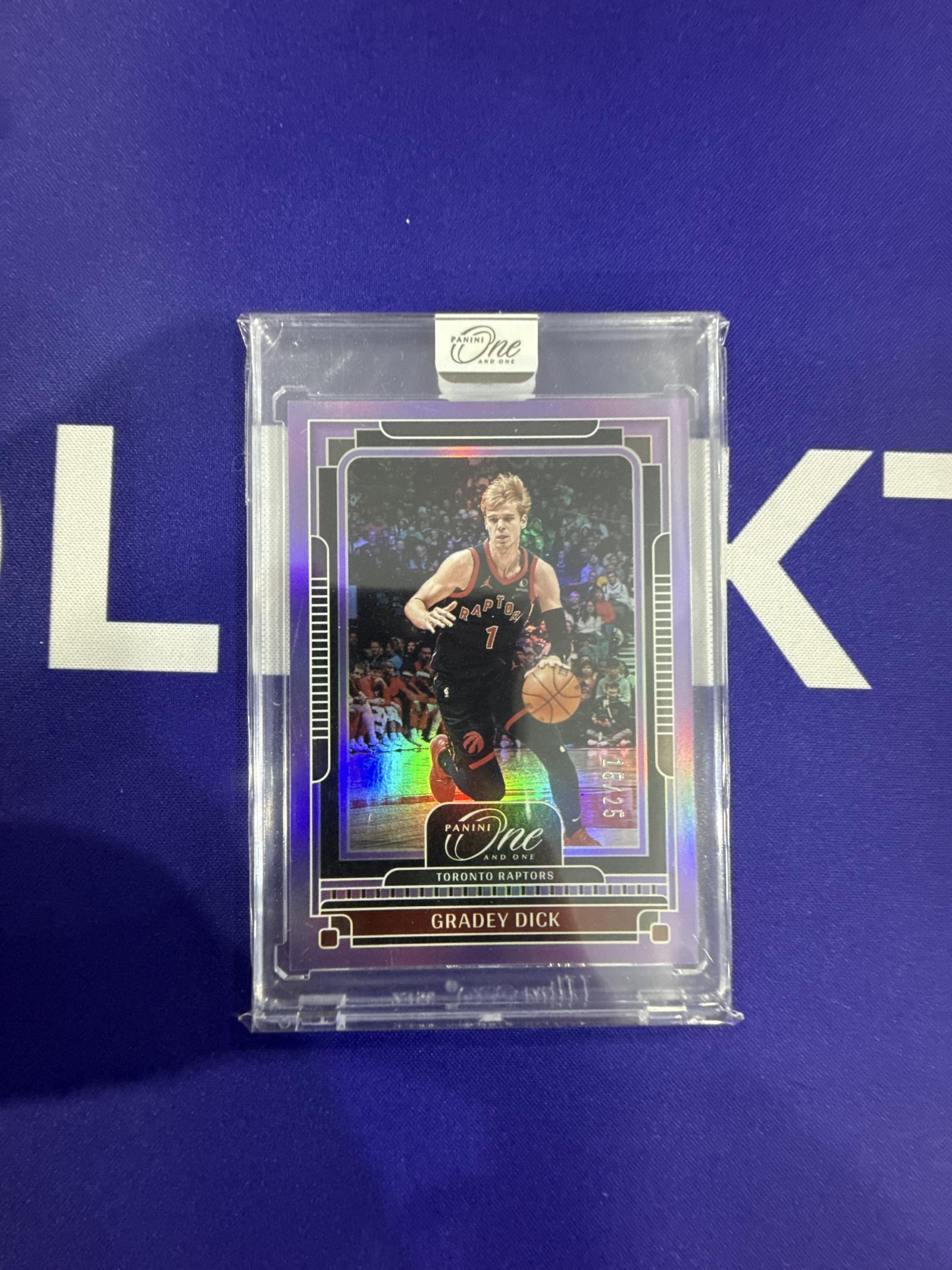 A graded collectible Panini One basketball card featuring Gradey Dick of the Toronto Raptors. This card is a purple prizm parallel and is numbered 017/125. The card is stored in a protective case.