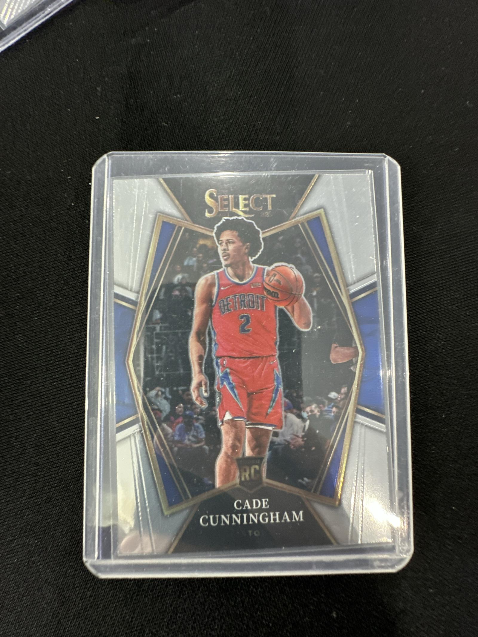 This is a 2021-22 Panini Select Rookie Card featuring Cade Cunningham of the Detroit Pistons. The card is encased in a protective plastic sleeve. The card shows minor surface scratches and edge wear visible through the case, but overall presents well for a collectible rookie card.