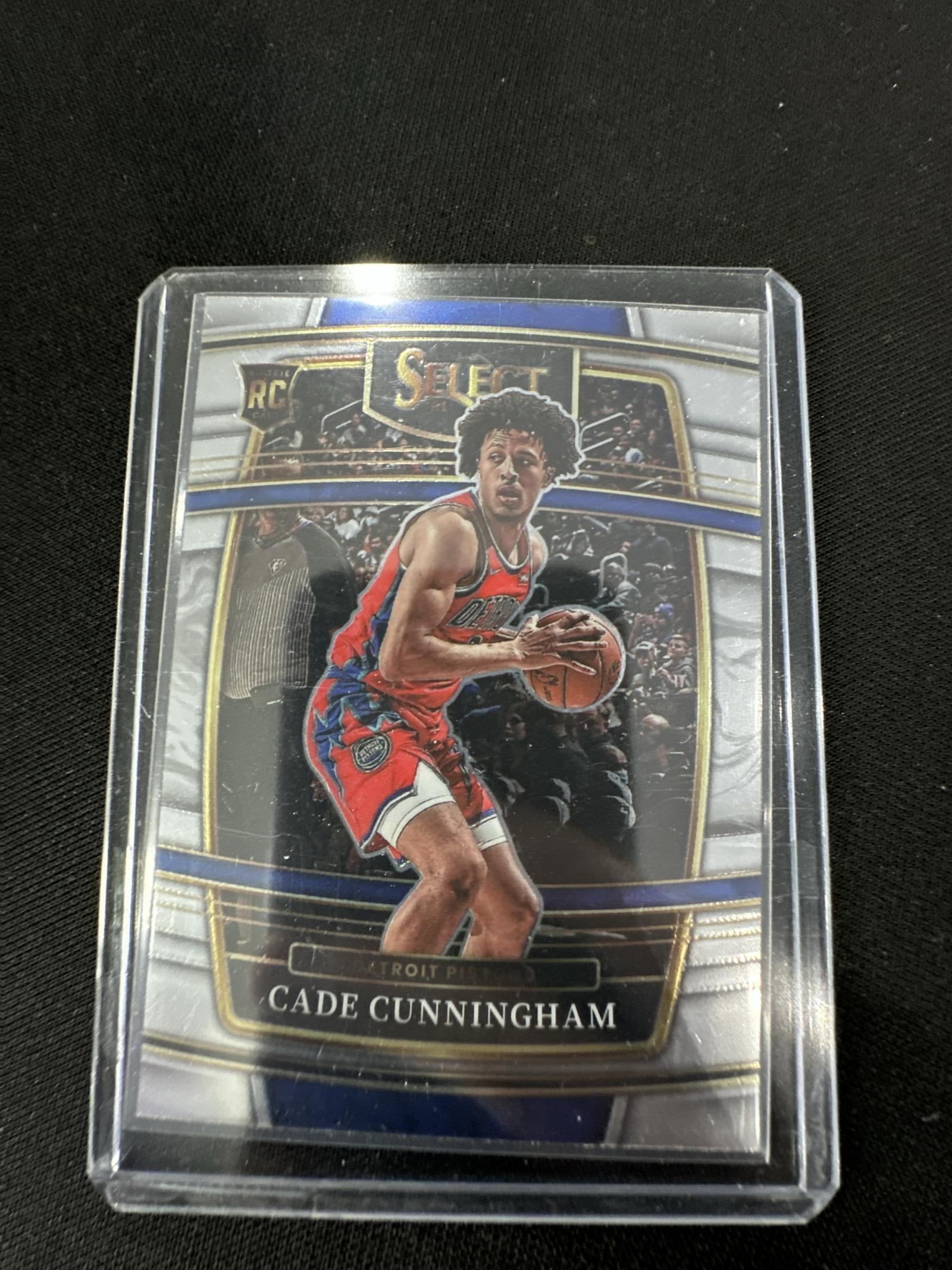 This is a 2021-22 Select basketball rookie card featuring Cade Cunningham of the Detroit Pistons. The card is encased in a protective sleeve, preserving its surface and edges well. A great collectible for fans and card collectors alike.