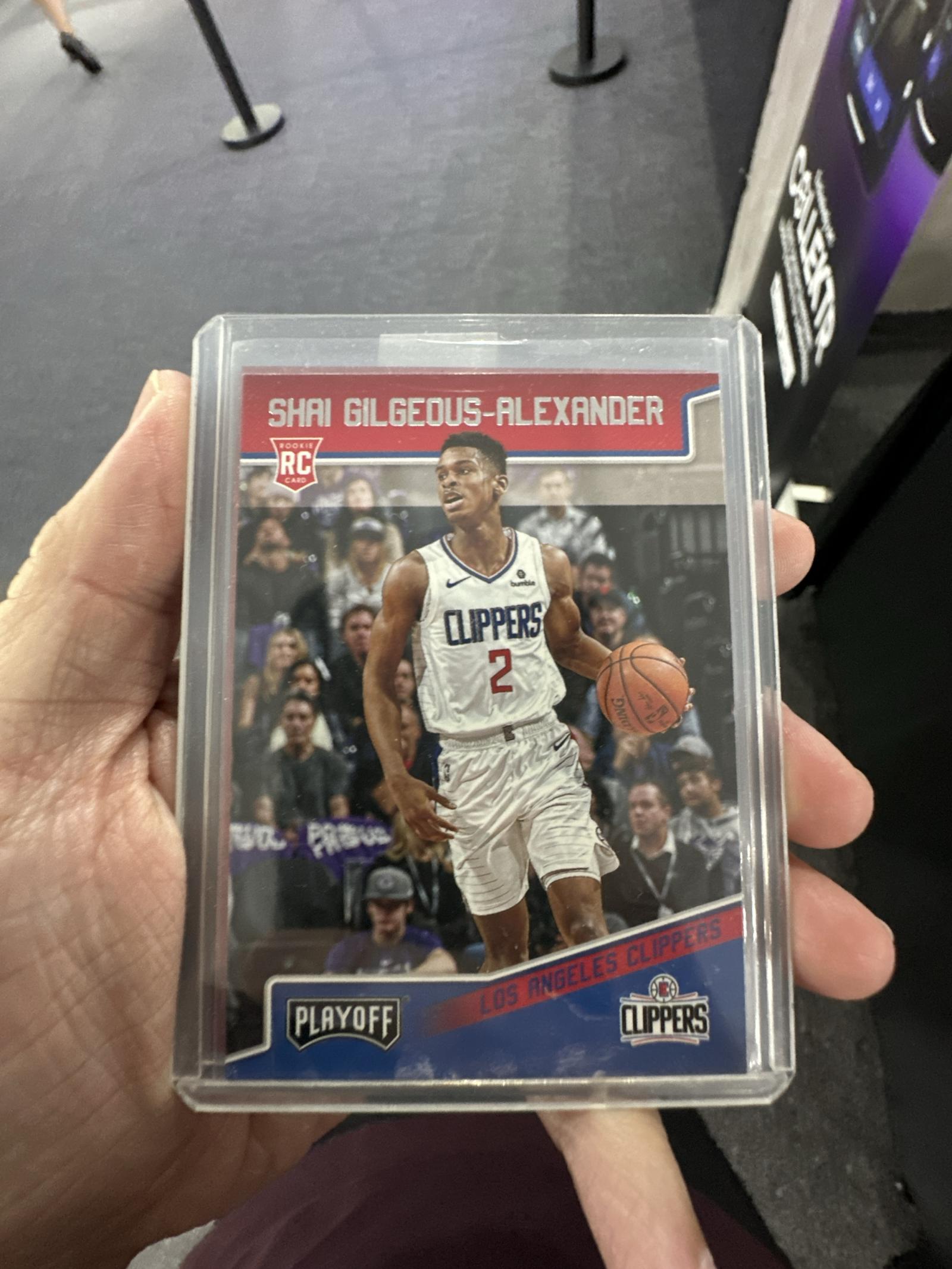 This is a 2021 Panini Playoff Shai Gilgeous-Alexander rookie card featuring the Los Angeles Clippers. The card is encased in a protective plastic sleeve, showing a clear and centered image of Shai in action. Ideal for collectors focusing on NBA rookies or Clippers memorabilia.