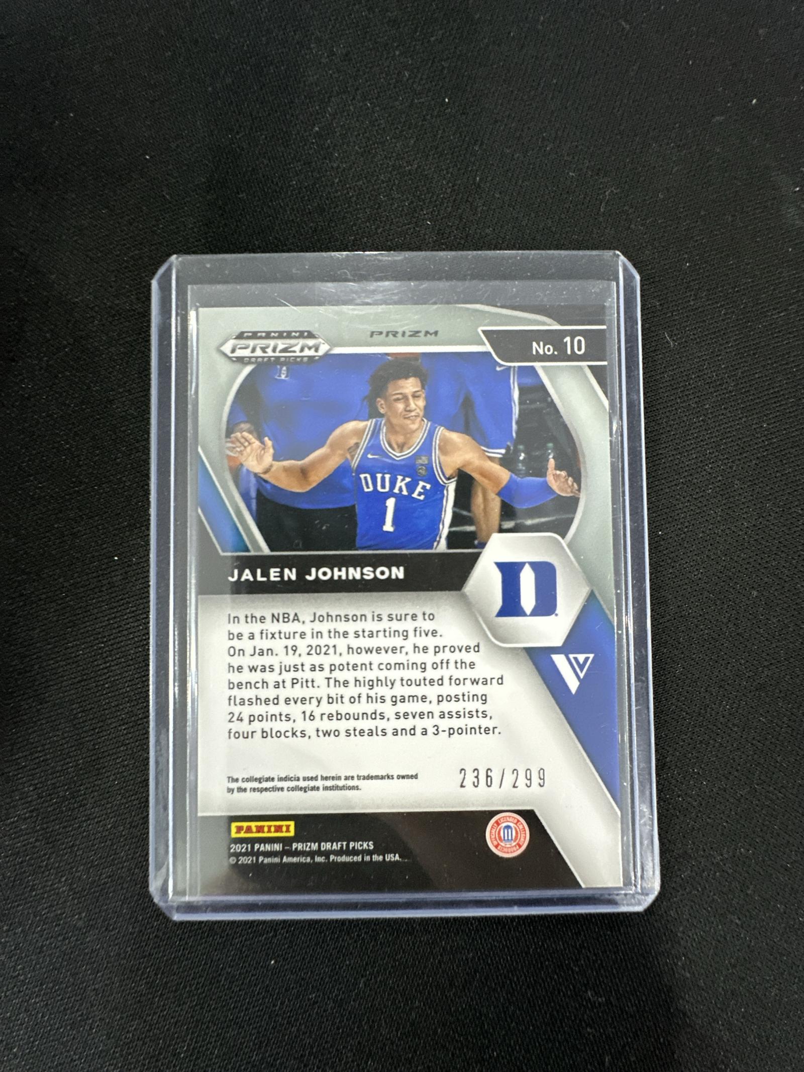This is a 2021 Panini Prizm Draft Picks basketball card featuring Jalen Johnson in his Duke uniform. This Red Prizm rookie card is numbered 236 out of a limited 299. The card is protected in a plastic sleeve and appears to be free of visible creases or surface scratches, with sharp corners and clear edges.