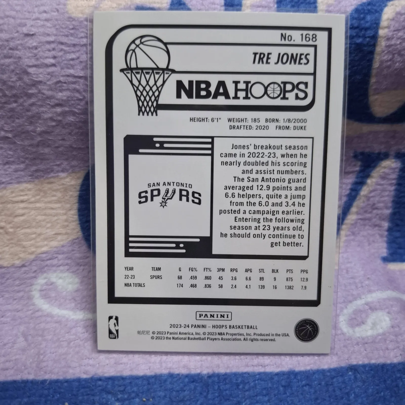 This is a 2022-23 NBA Hoops basketball card featuring a San Antonio Spurs player in action. The card showcases excellent photography with vibrant colors and sharp details, capturing a dynamic game moment. Perfect for collectors of NBA Hoops or Spurs memorabilia.