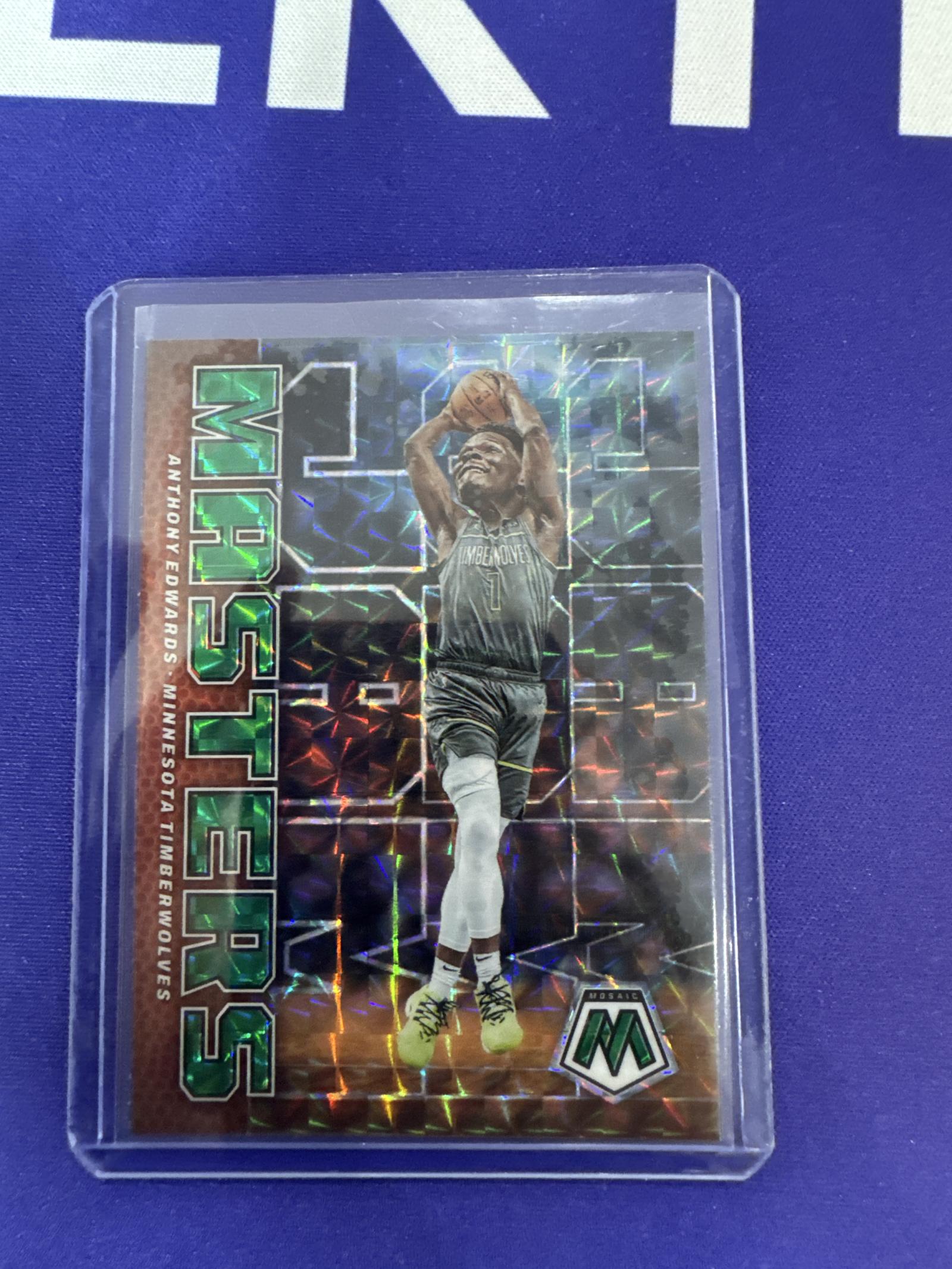 This 2022-23 Panini Mosaic basketball card features Anthony Edwards of the Minnesota Timberwolves. It is the 'Masters' variation, showcasing a vibrant holographic design. The card is housed in a protective case to maintain its quality. Perfect for collectors and fans of Anthony Edwards and Timberwolves.