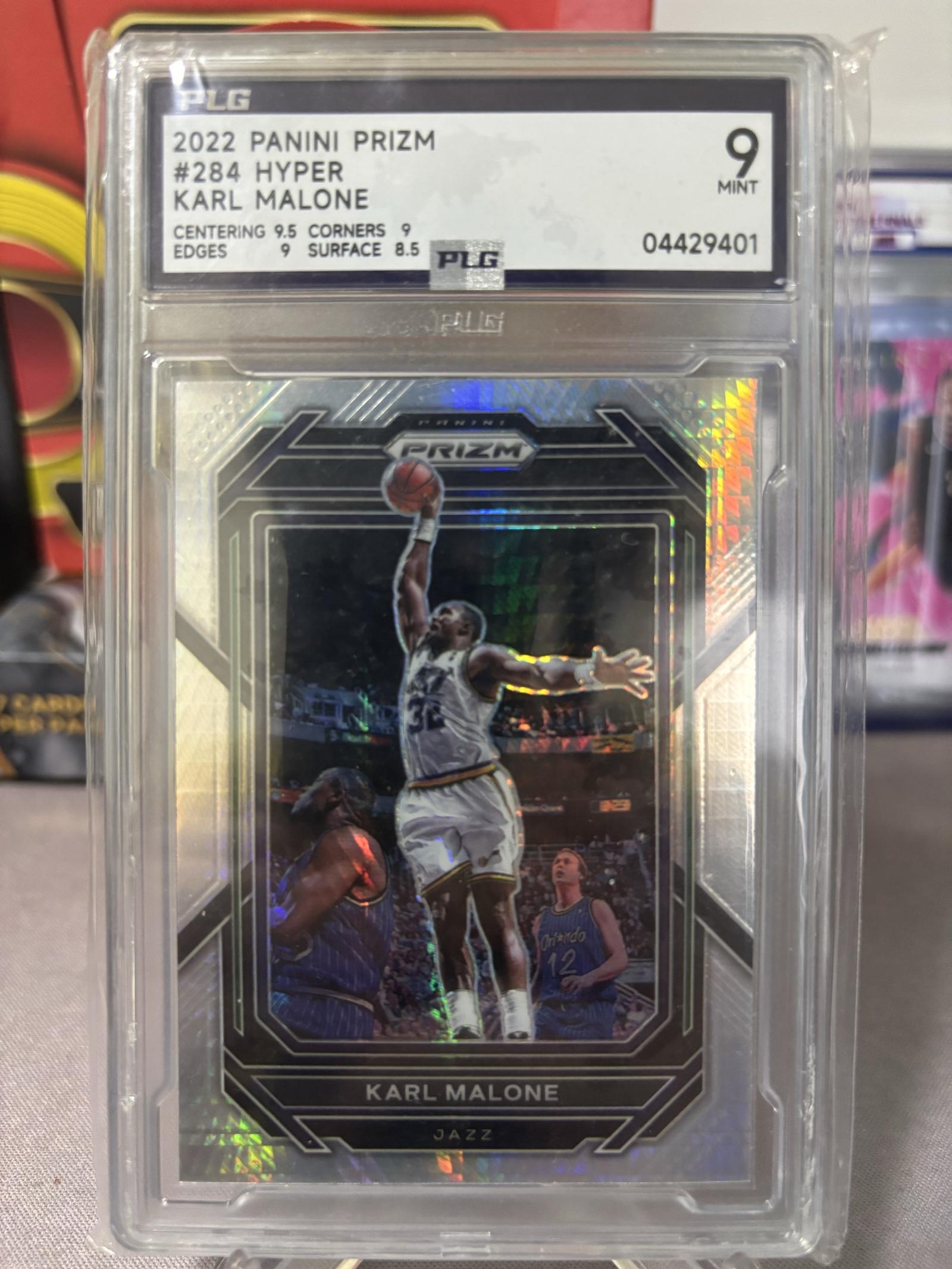 This is a 2022 Panini Prizm #284 Hyper Karl Malone basketball card, graded 9 (Mint) by PLG. The card features Karl Malone in action with a holographic prizm finish and is encased in a protective slab. It displays excellent centering (9.5), corners (9), edges (9), and a slightly lower surface grade (8.5), making it a highly collectible card in near-mint to mint condition.