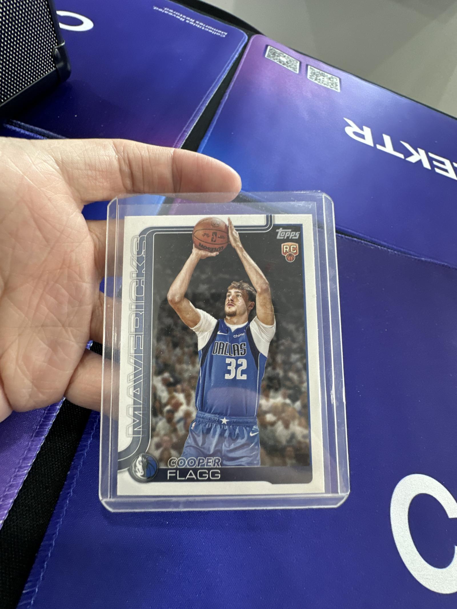 This is a 2022 Topps basketball rookie card featuring Cooper Flagg, player for the Dallas Mavericks. The card shows Flagg in action during a game and is encased in a protective sleeve. A great collectible for NBA and Mavericks fans.
