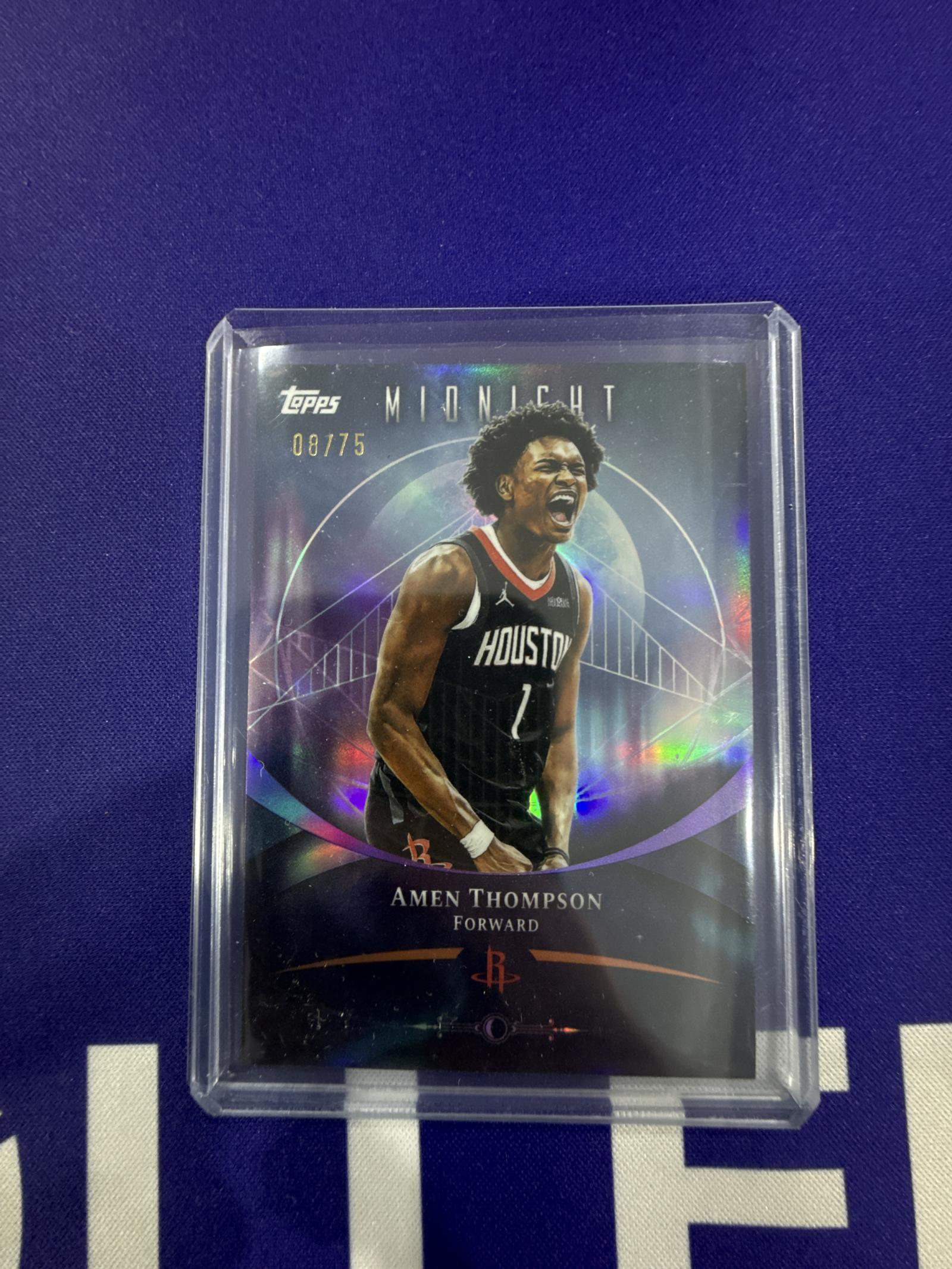 Limited edition Amen Thompson basketball card from the 2022 Topps Midnight series, numbered 08/75. Features Amen Thompson in Houston Rockets uniform, displayed in a protective case. Card shows vibrant colors and holographic details with no visible surface damage or wear.