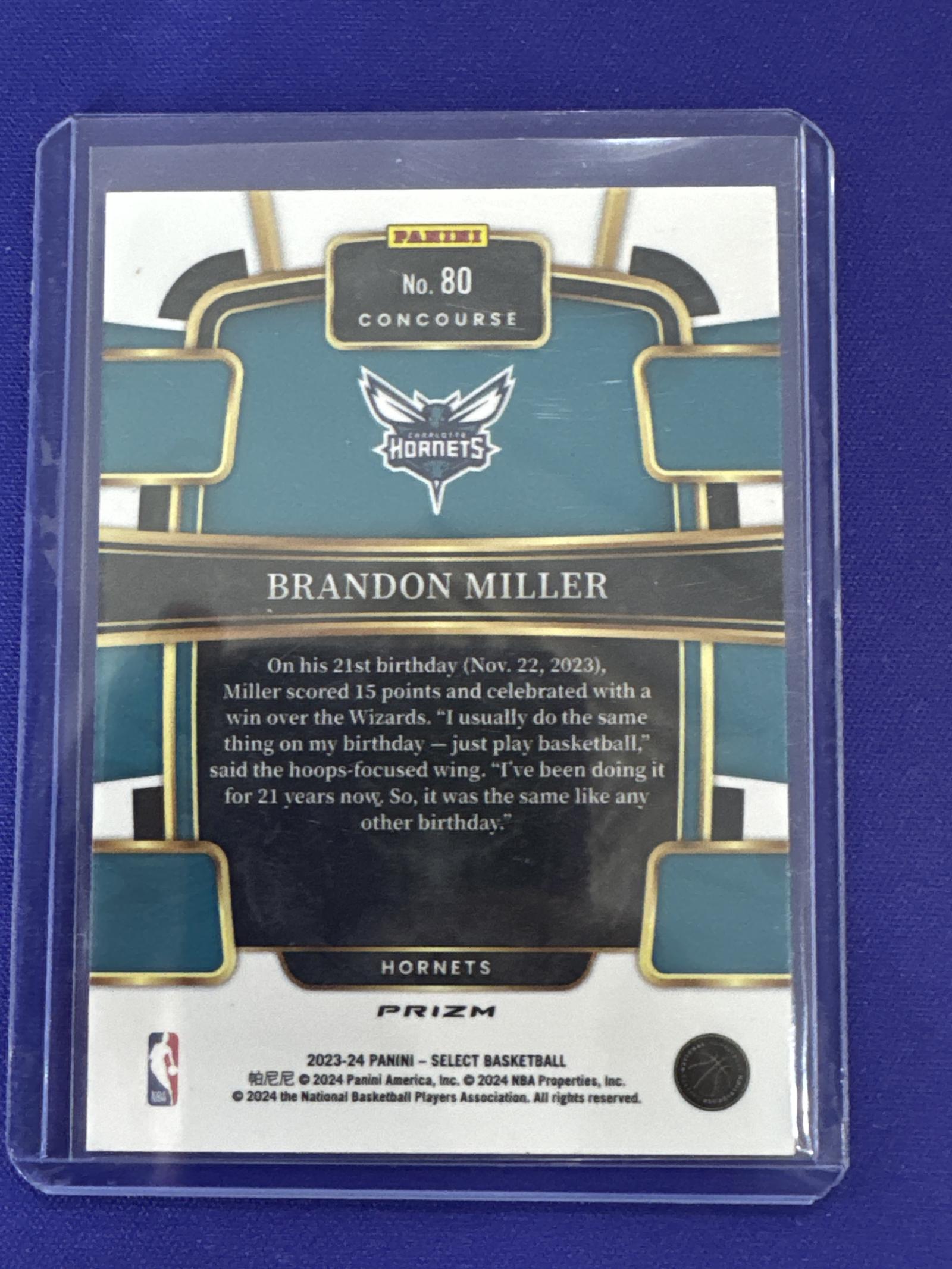 This is a 2023-24 Panini Select Basketball card featuring Brandon Miller of the Charlotte Hornets. It is a Blue Prizm parallel rookie card (#80 Concourse) showcasing Miller dribbling on the court. The card is encased in a protective sleeve and displays a vibrant, reflective design with gold accents. The back of the card highlights a brief player bio and notable birthday performance details. A great addition for collectors of modern NBA rookies and Hornets memorabilia.
