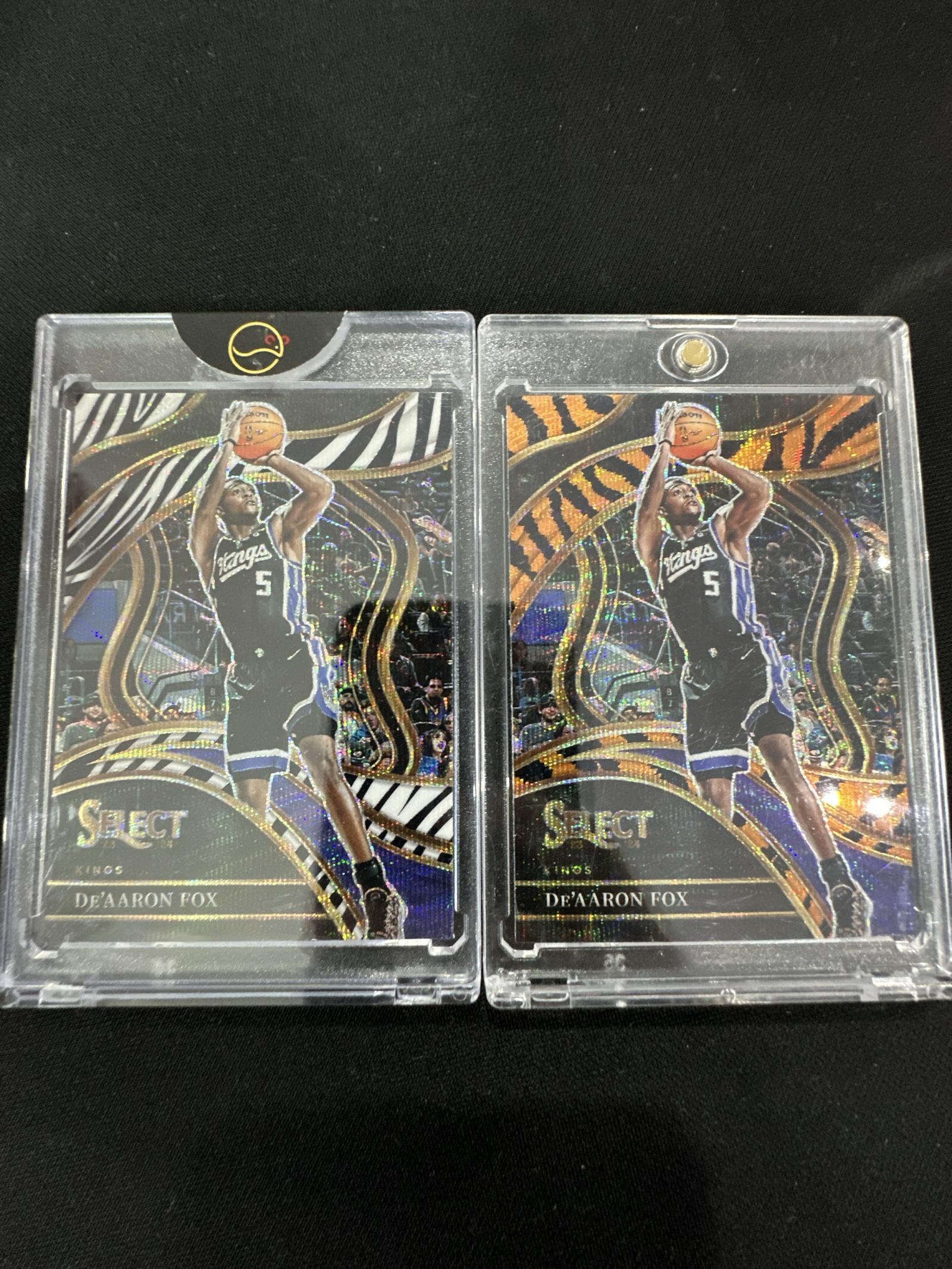 Set of two 2023-24 Panini Select Prizm basketball cards featuring De'Aaron Fox of the Sacramento Kings. Both cards are in protective cases and showcase Fox in action with vibrant zebra and tiger pattern backgrounds. The backs include player info and team logos. Great collectible for fans of De'Aaron Fox and Sacramento Kings.