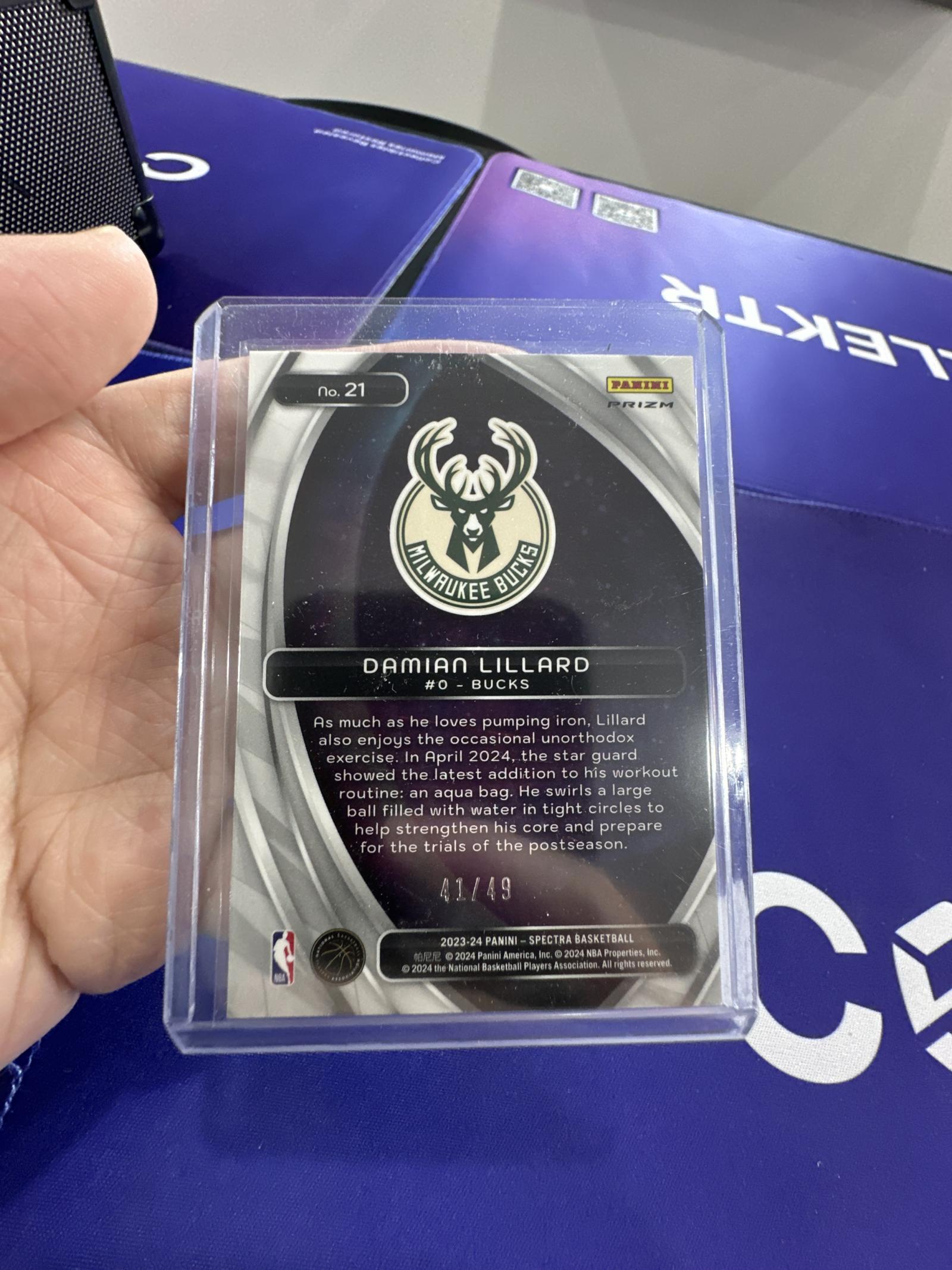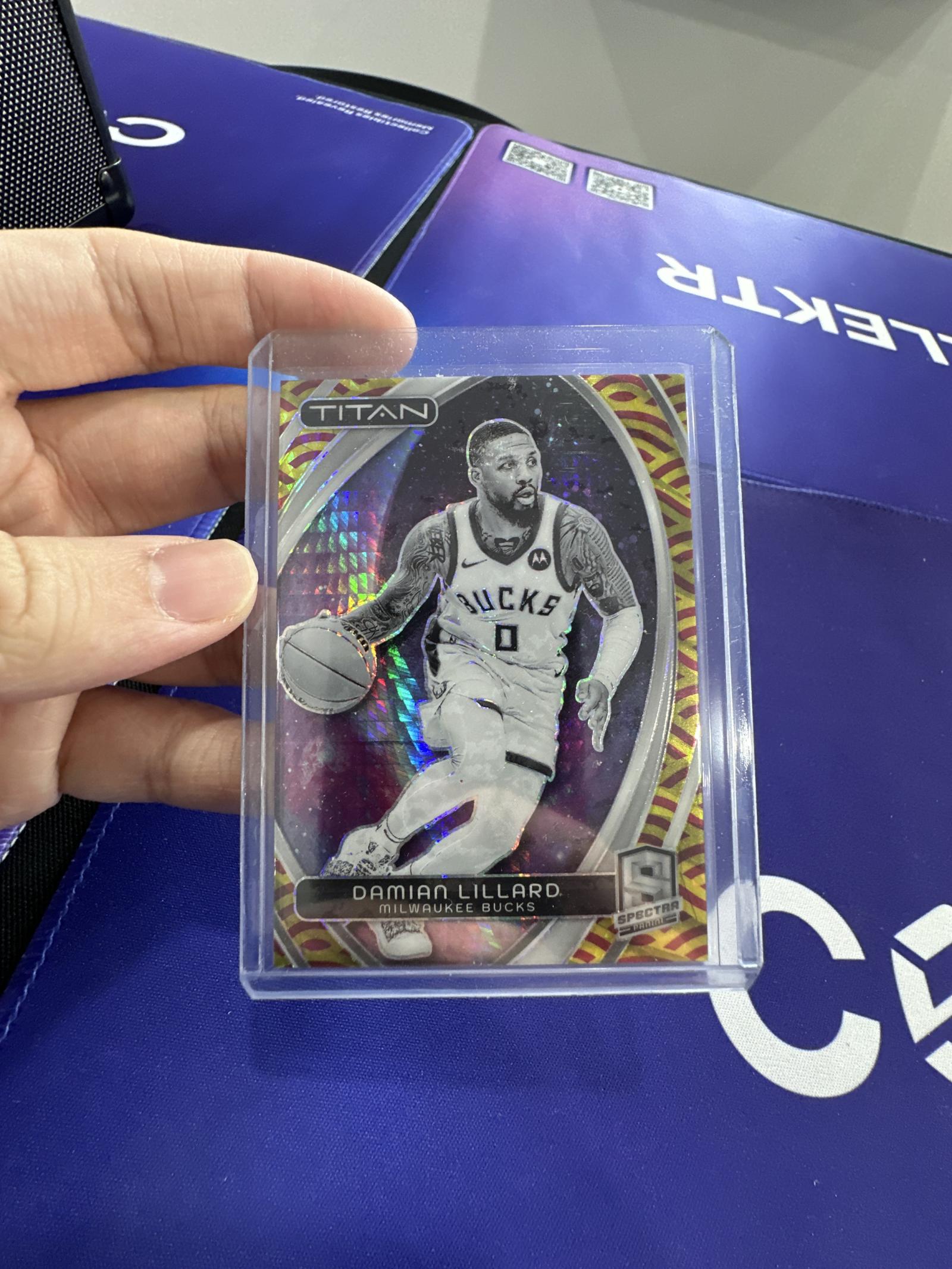 Limited edition Damian Lillard basketball card from the 2023-24 Panini Spectra series. The card features a Titan Prizm design with striking holofoil effects and is numbered 41 out of 49. Showcases Lillard in his Milwaukee Bucks uniform. Comes in a protective case to maintain condition.