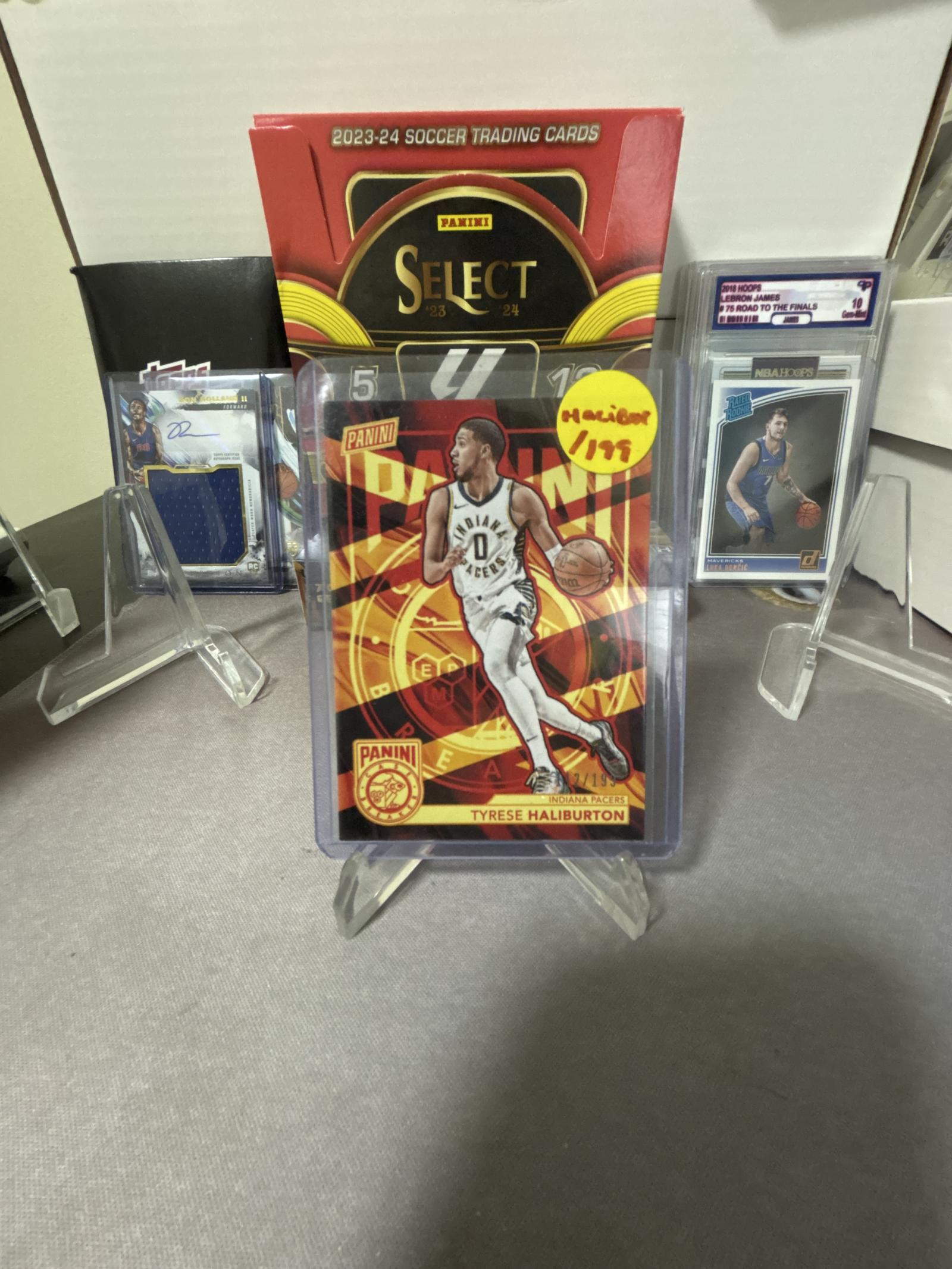 Limited edition 2023-24 Panini basketball card featuring Tyrese Haliburton of the Indiana Pacers. Card is numbered 112 out of 195, showcasing a dynamic design with vibrant colors. Protected in a clear plastic sleeve and displayed on a stand. Includes original packaging and other basketball and sports cards in the background.