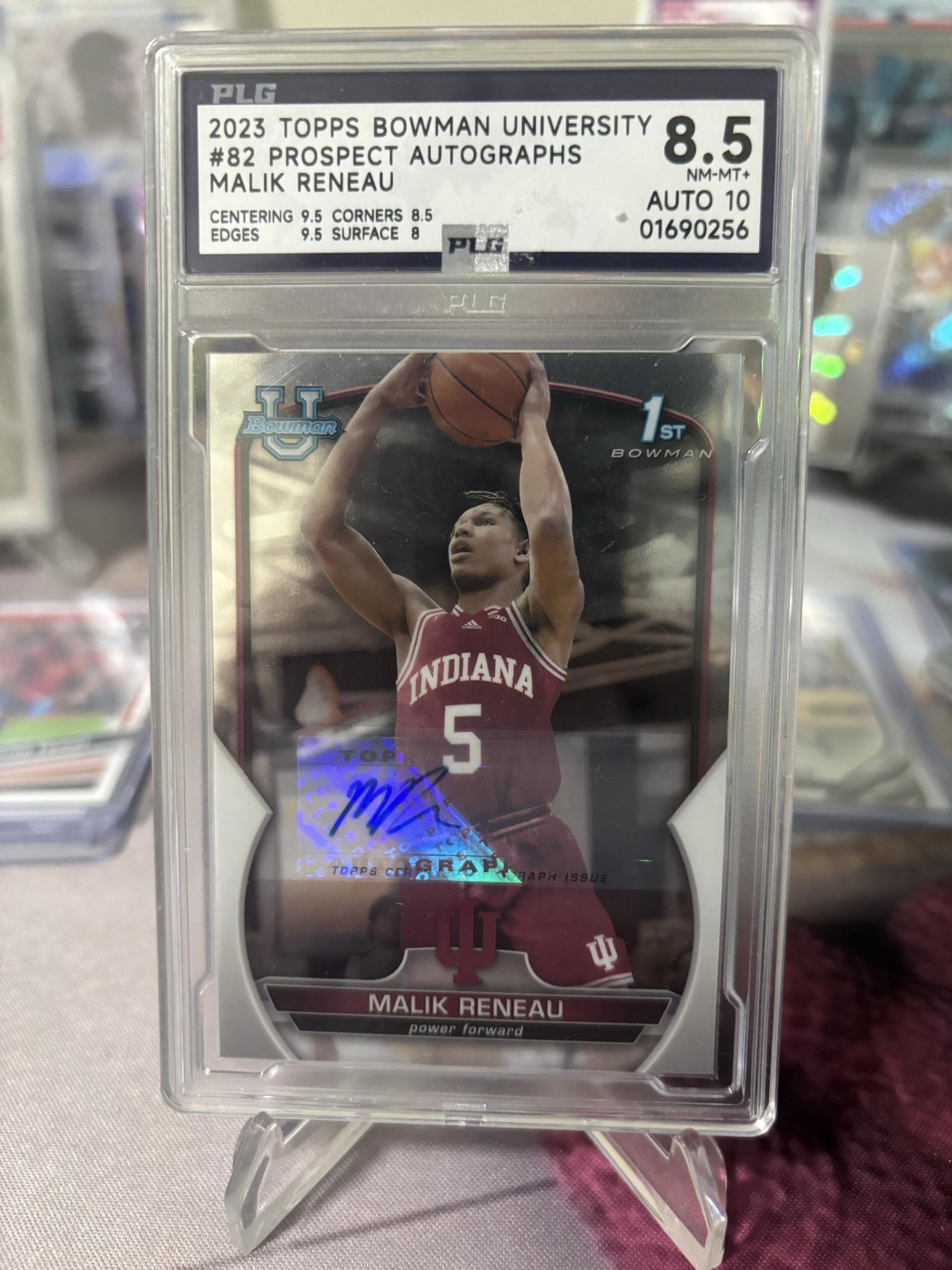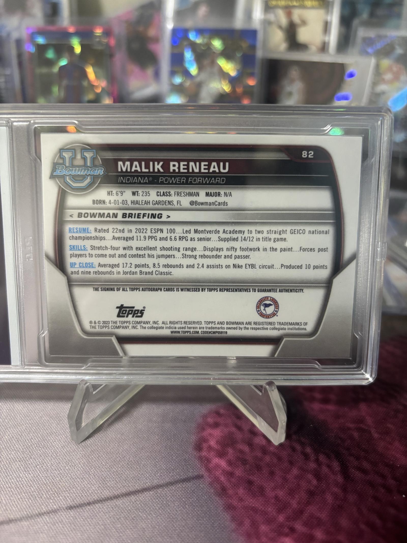 This is a 2023 Topps Bowman University #82 Malik Reneau Prospect Autograph basketball card featuring Indiana power forward Malik Reneau. The card is graded by PLG with an overall grade of 8.5 (NM-MT+) and an autograph grade of 10. It includes a high-quality autograph and features Malik Reneau in his Indiana uniform. The card backs summarize his impressive basketball skills and college performance highlights.
