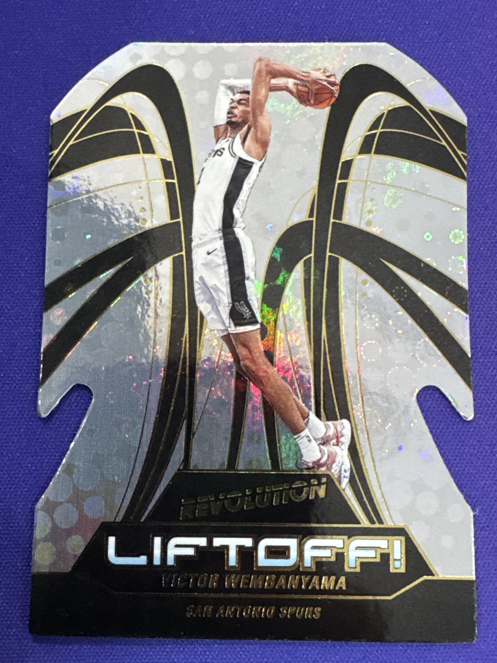 This 2024-25 Panini Revolution Basketball card features the rising star Victor Wembanyama of the San Antonio Spurs. The 'Liftoff!' insert showcases Wembanyama in mid-dunk with a striking holographic and die-cut design. The back highlights his impressive debut and recognition in the 2023-24 season and the NBA GM Survey. A well-preserved collectible for fans and collectors of emerging NBA talent.
