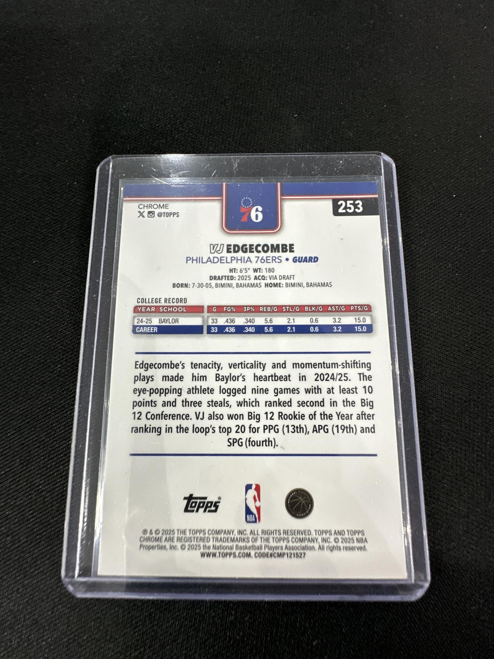 This is a 2024-25 Topps Chrome rookie basketball card featuring VJ Edgecombe of the Philadelphia 76ers. The card highlights Edgecombe's impressive college record at Baylor and his achievements such as Big 12 Rookie of the Year. The card is encased in a protective plastic sleeve to preserve its condition.