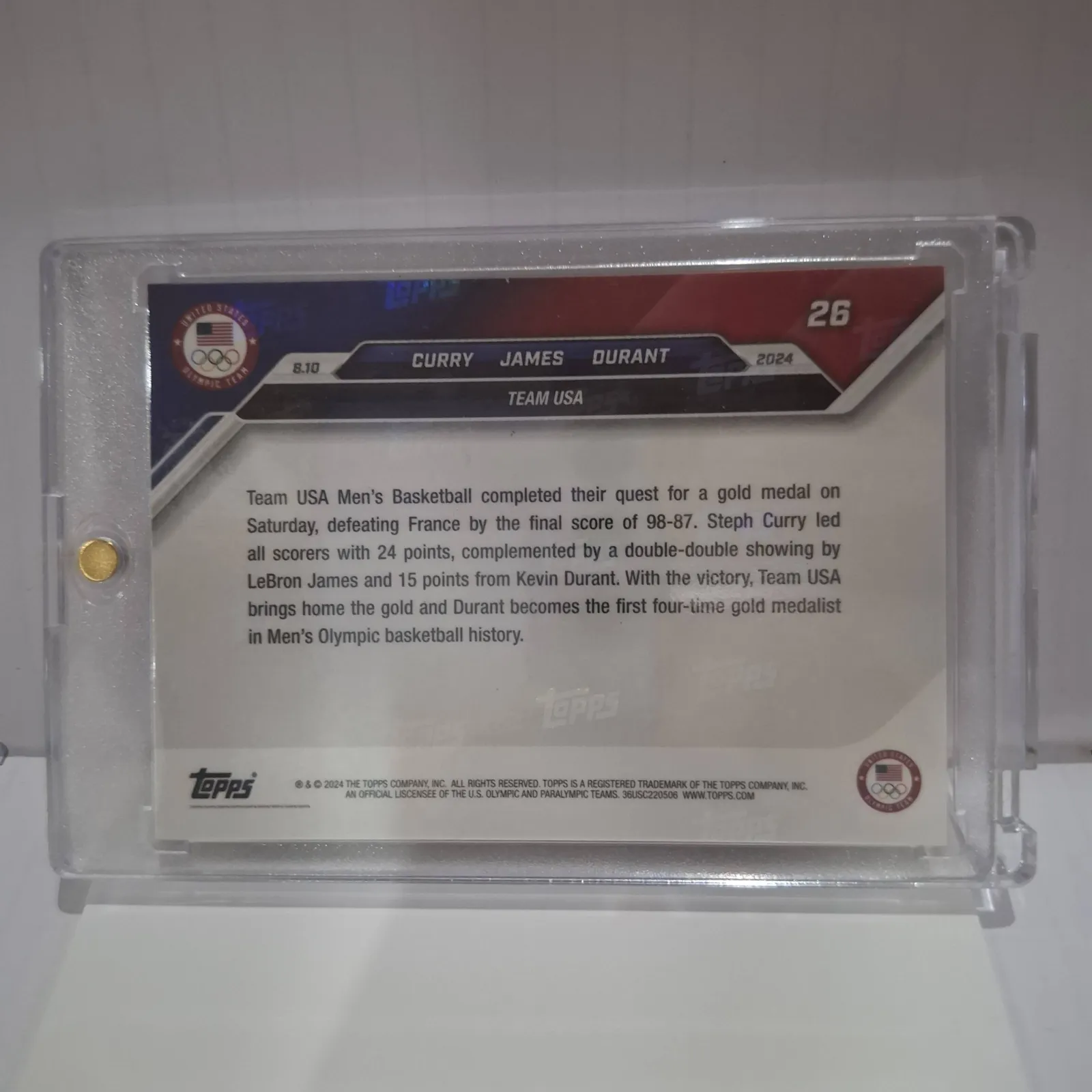 Topps Now 2024 basketball card featuring Team USA stars Stephen Curry, LeBron James, and Kevin Durant celebrating their fifth consecutive Olympic gold medal victory over France. The card is encased in a protective plastic case.